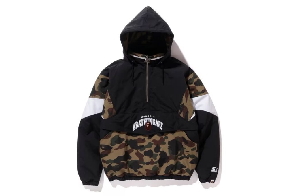 A BAPE se juntou com a Starter Black Label para apresentam uma versão atualizada de um dos estilos de jaqueta mais icônicos e populares dos anos 90, a Starter Pullover Hoodie Jacket. A jaqueta de nylon com painéis vem em preto/branco com a camuflagem icônica da marca japonesa caracterizada no corpo, dentro do capuz e em torno da linha do pescoço da jaqueta. Não seria o ícone que é sem o grande do logotipo do Starter, pendurado no puxador do zíper, logo acima do bolso do peito da jaqueta.
