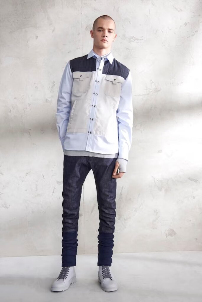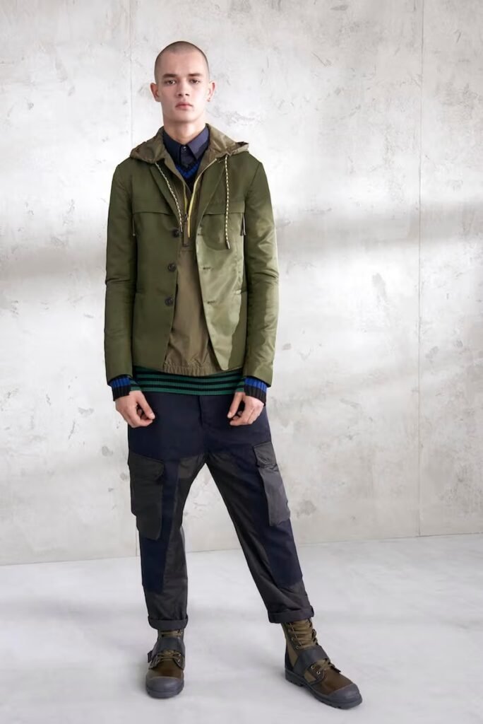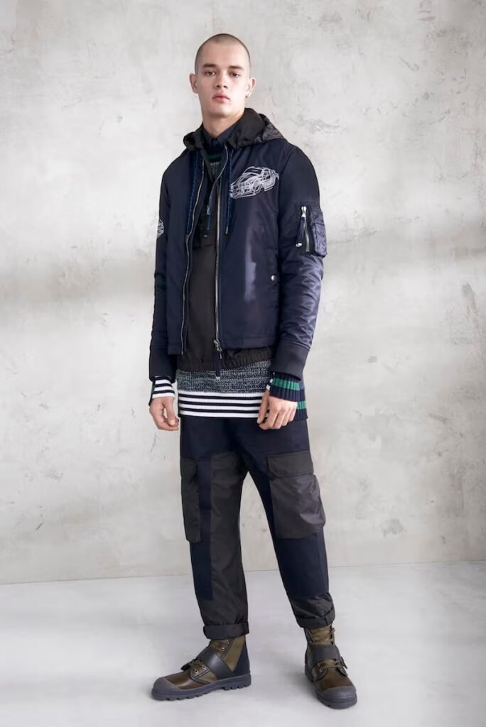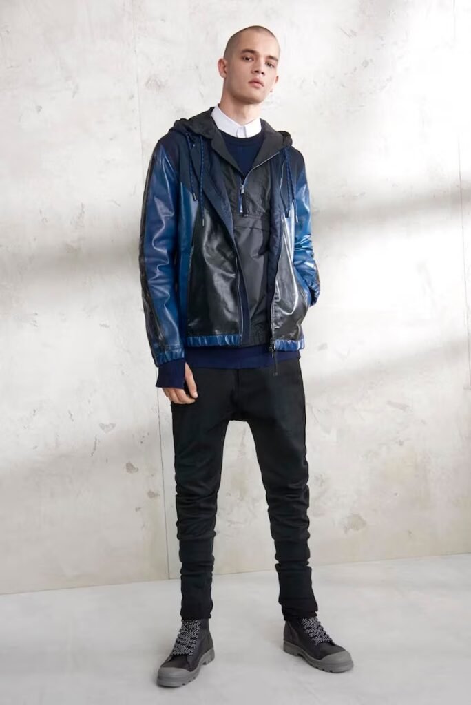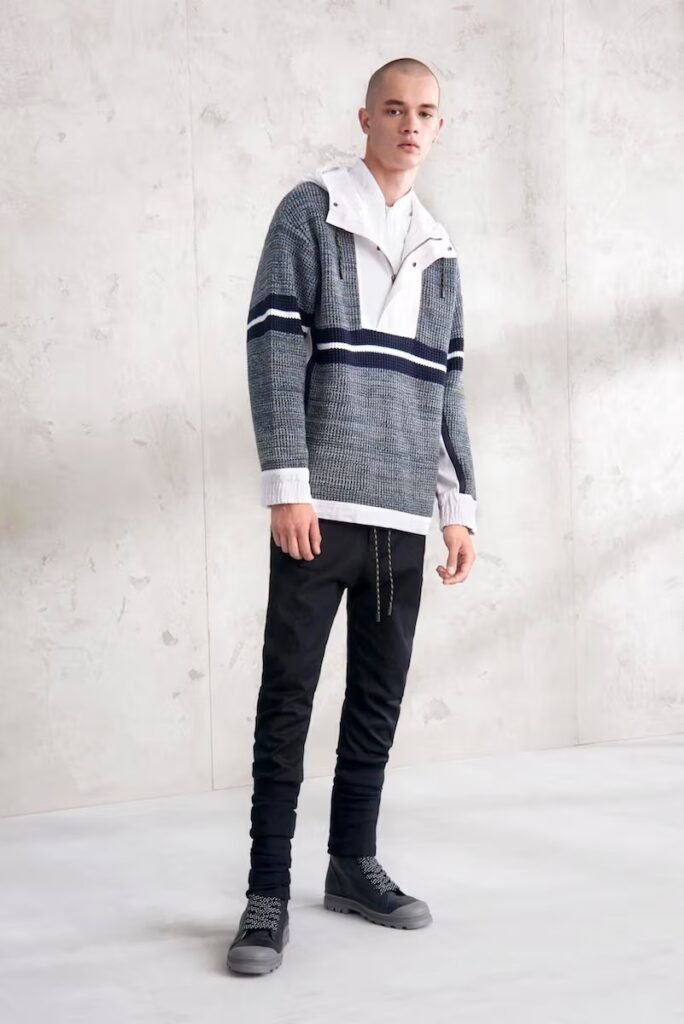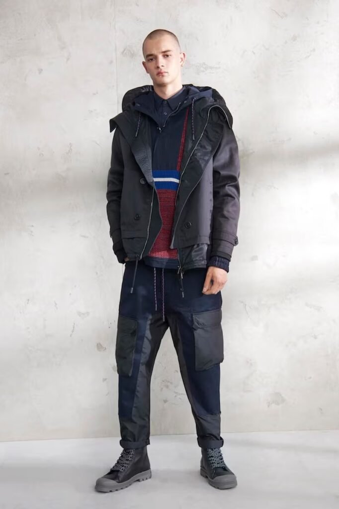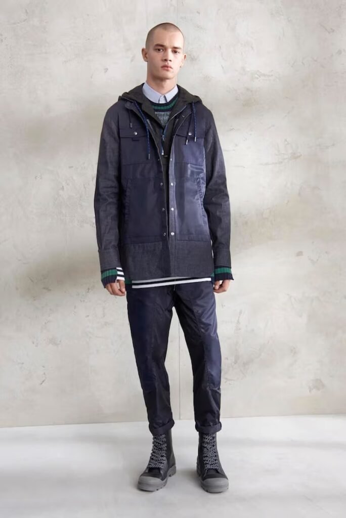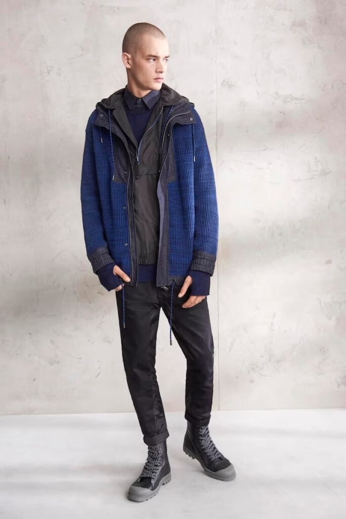 Jeans slim e calças compõem a maioria na parte de baixo, com algumas calças mais largas que oferecem equilíbrio para o estilo robusto e sapatos de estilo Palladium. A paleta de cores é tão expansiva quanto os têxteis, com jaquetas de couro em azul e preto, com anoraks cinza e cagoules de poliéster verde que combinam com calças de material misto de olive e navy. Confira a gama completa no site da marca.