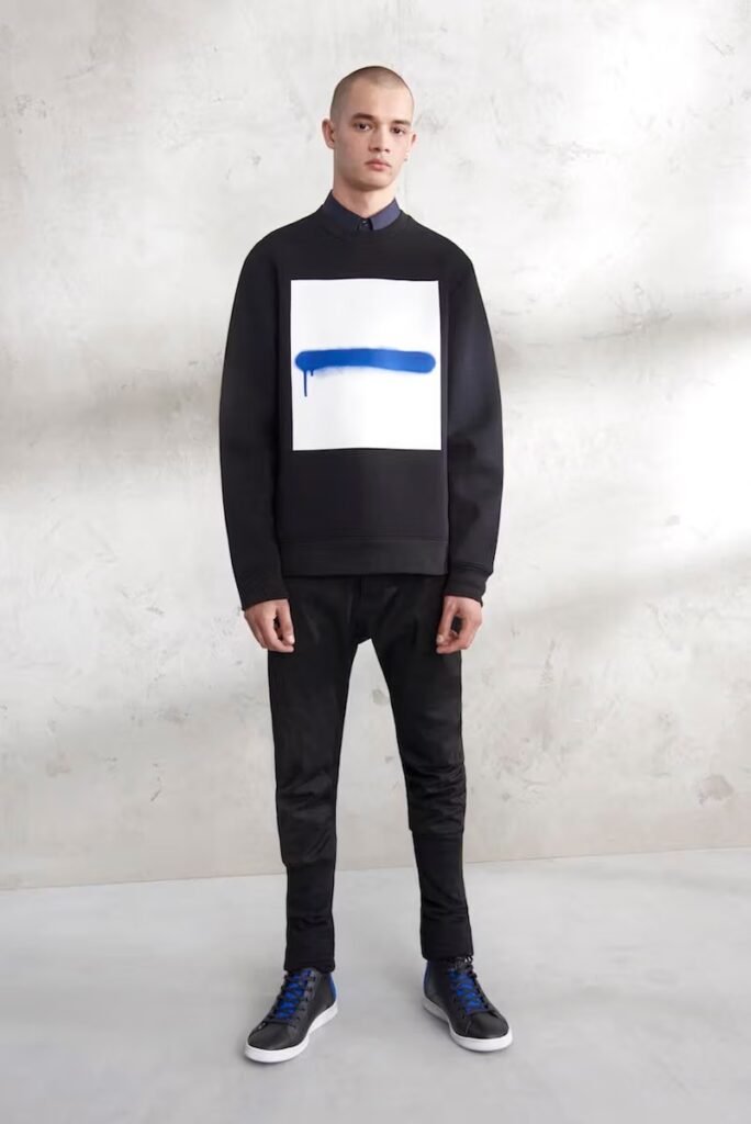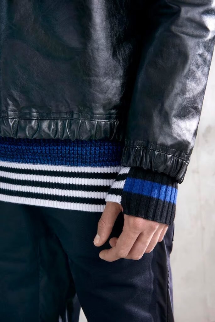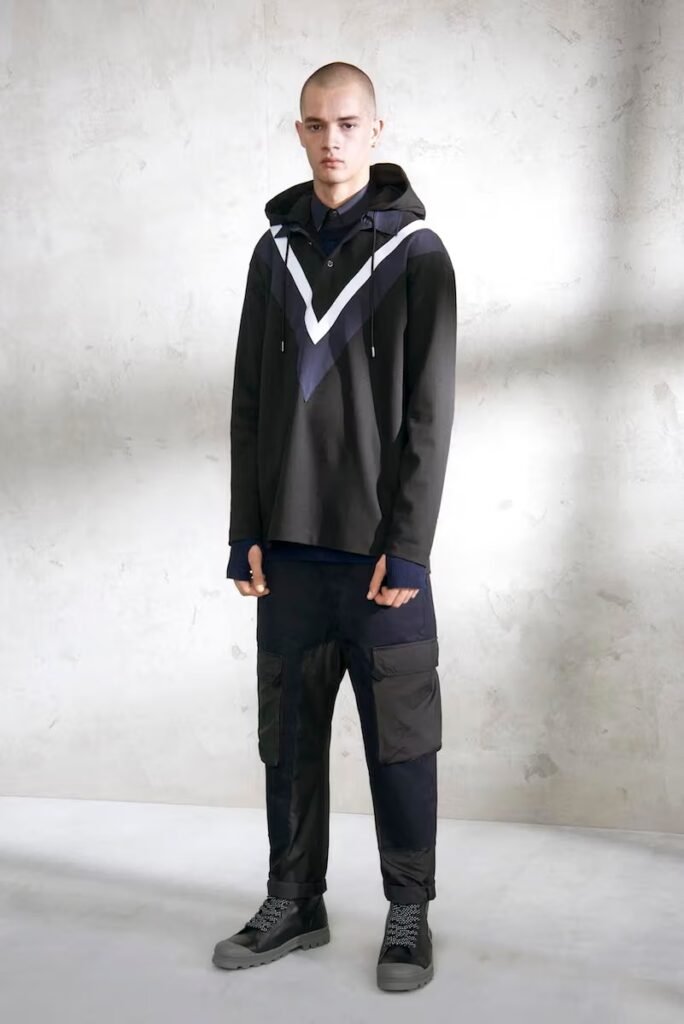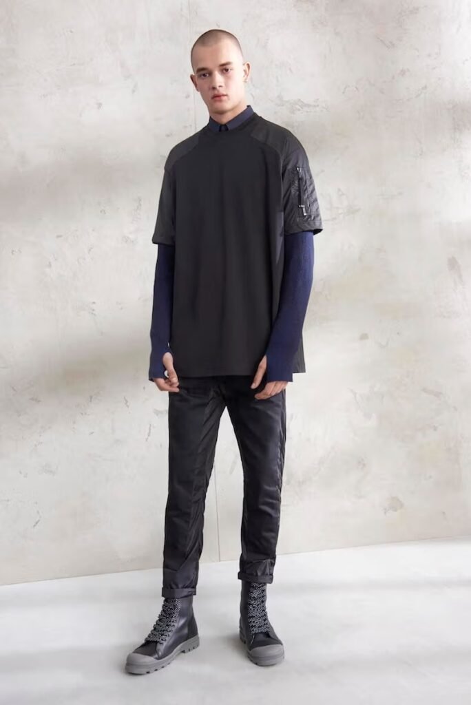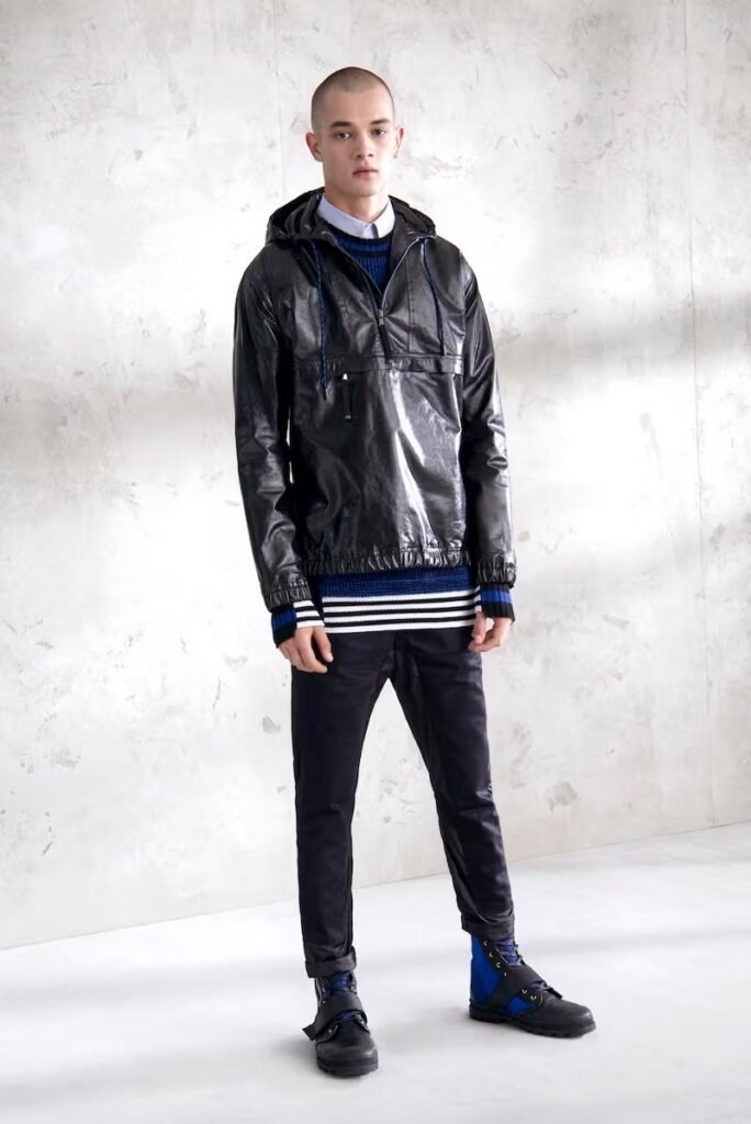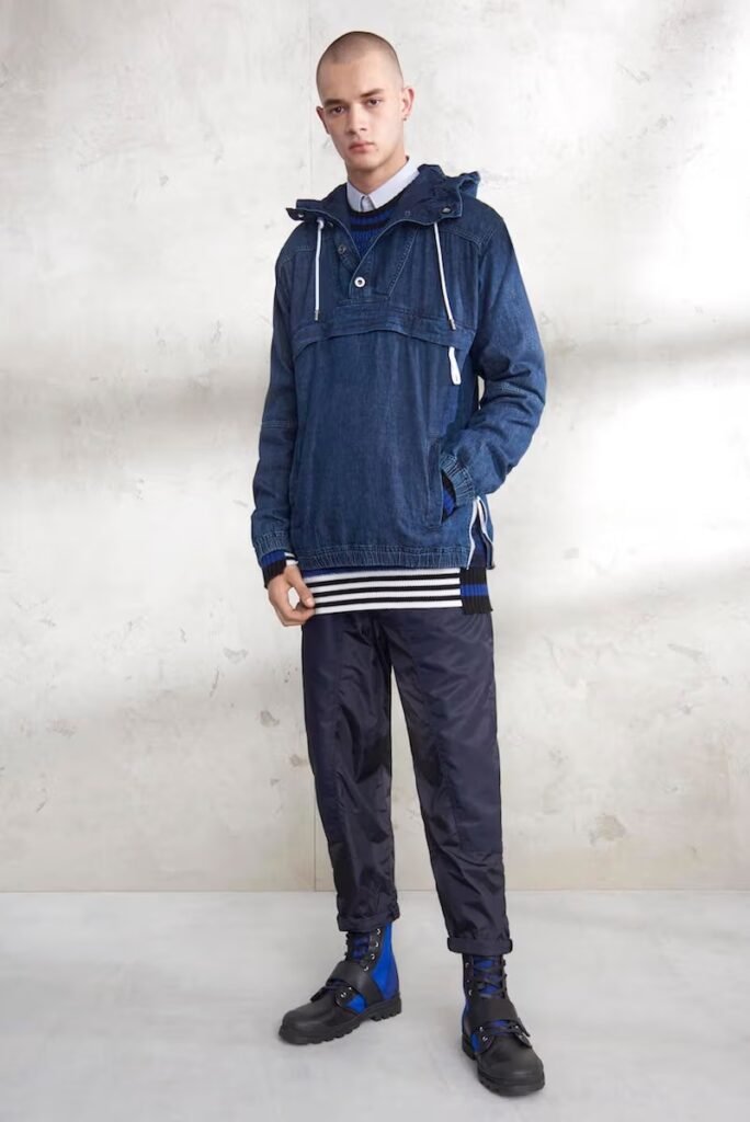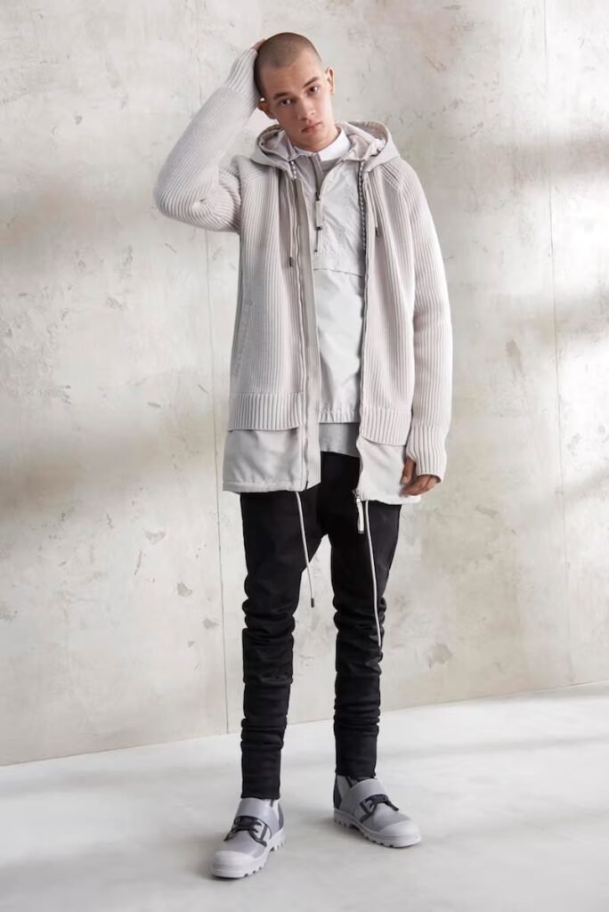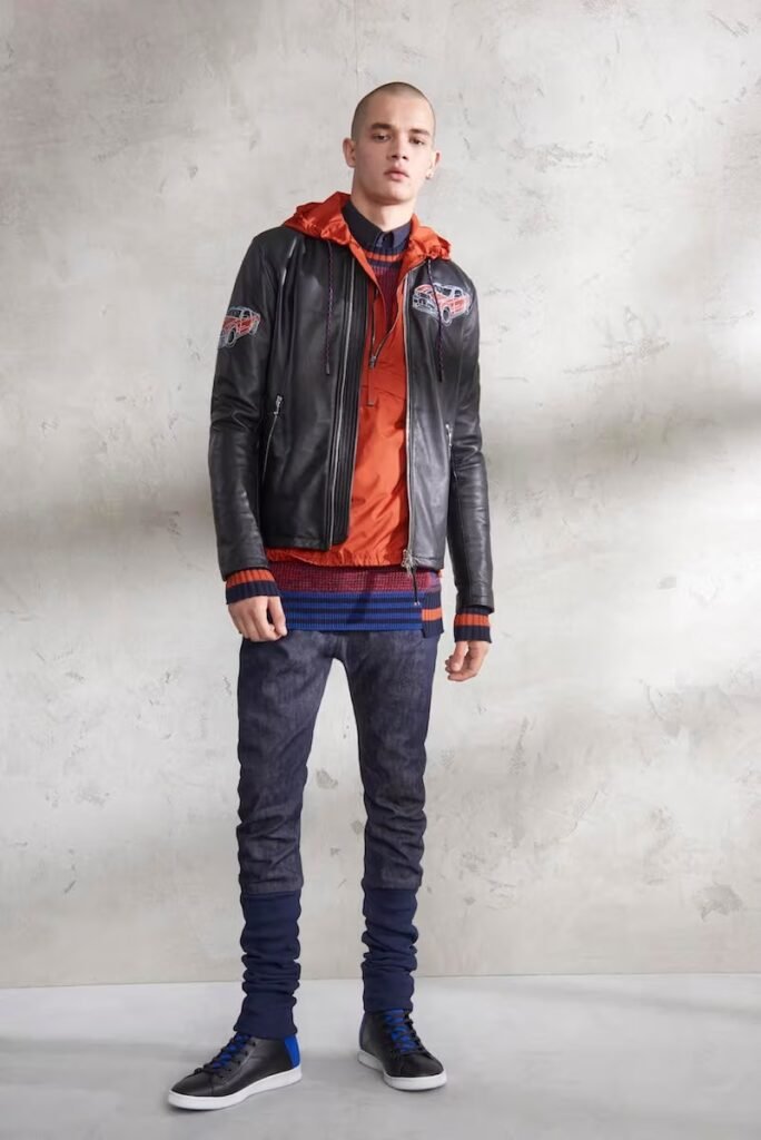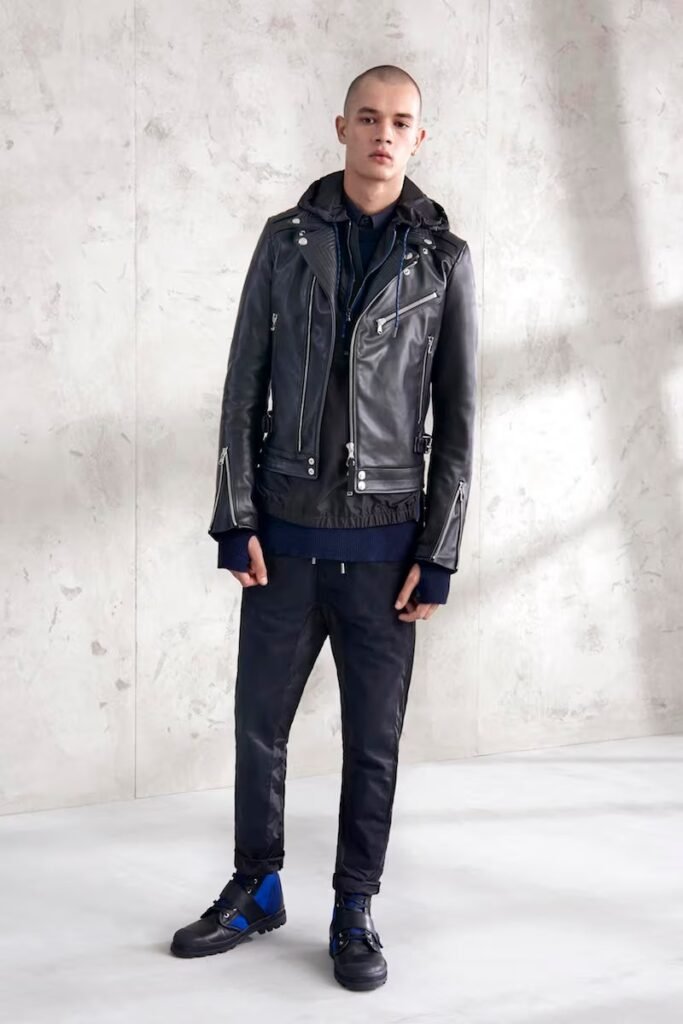 Jeans slim e calças compõem a maioria na parte de baixo, com algumas calças mais largas que oferecem equilíbrio para o estilo robusto e sapatos de estilo Palladium. A paleta de cores é tão expansiva quanto os têxteis, com jaquetas de couro em azul e preto, com anoraks cinza e cagoules de poliéster verde que combinam com calças de material misto de olive e navy. Confira a gama completa no site da marca.