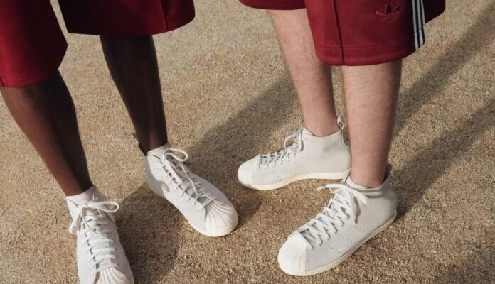Outros clássicos da marca ganham releituras de peso: o WB Superstar Hi surge com cabedal em camurça minimalista, entressola mais fina e as icônicas Three Stripes perfuradas. Já a tradicional Adilette é transformada em luxo artesanal com palmilha de couro e tiras superiores trançadas manualmente no Brasil — um gesto que exalta o fazer local e homenageia a reinvenção criativa de comunidades africanas que utilizam pneus reciclados para criar solados de calçados.