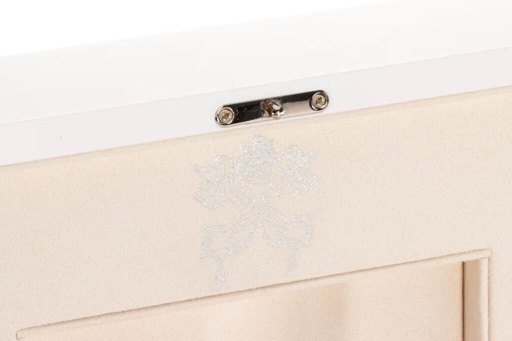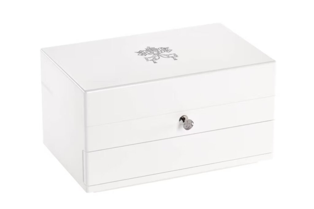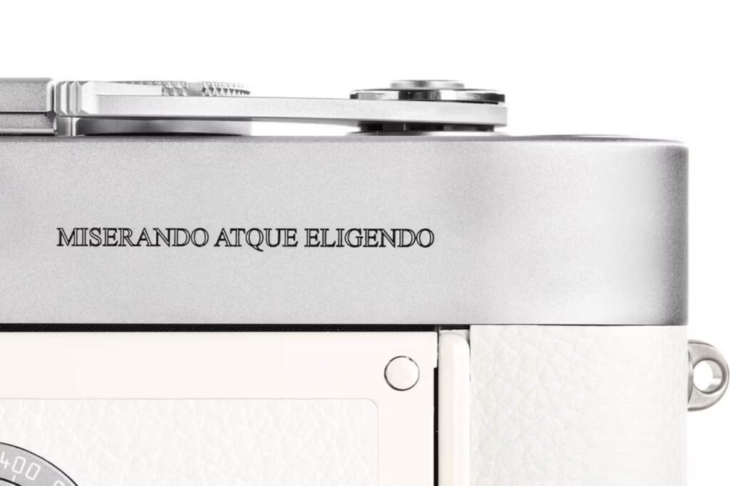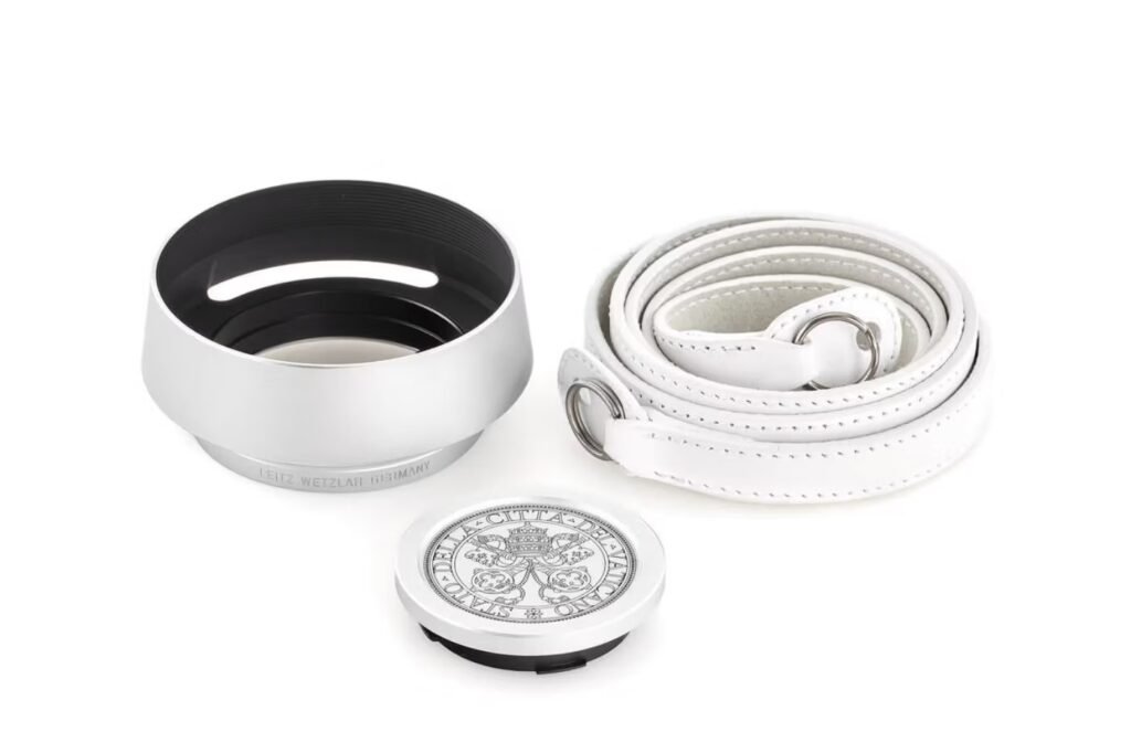 O acabamento reflete toda a atenção ao detalhe: cobertura branca especial, placa base, portas traseiras e botões decorados acompanham gravações simbólicas como as Chaves de Pedro na tampa do flash e o lema papal “Miserando atque eligendo” na placa superior, todos preenchidos em esmalte branco, dourado e preto. A lente replica esse tratamento, enquanto as tampas do corpo e da lente exibem o brasão da Cidade do Vaticano. Ambos os itens trazem a data em numerais romanos “A.D. MMXXIV”, marcando o ano da apresentação, e vêm em estojo de apresentação personalizado.