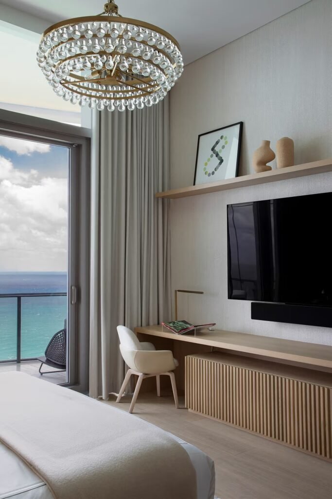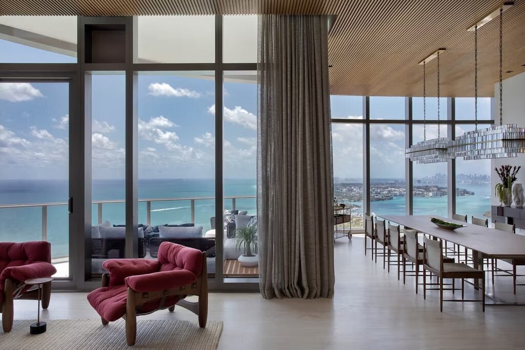 Ao final do dia, o teto de carvalho se suaviza com a luz dourada, o piso de pedra esfria sob os pés descalços e o horizonte se funde entre o sal do mar e os arranha-céus de Miami. Um projeto que mostra como o design pode traduzir memória, identidade e estilo de vida, criando um lar que é ao mesmo tempo refúgio íntimo e expressão de luxo contemporâneo.