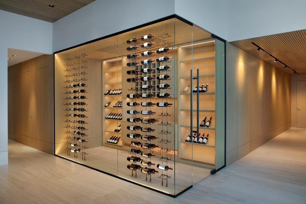 O layout original foi repensado para atender a longas estadias: a suíte master ganhou novo fluxo e mais privacidade, a cozinha passou a ter exaustor suspenso da Futuro Futuro e prateleiras abertas que organizam o espaço em torno de um eixo visual, enquanto uma adega de vidro virou ponto de encontro em ocasiões sociais.