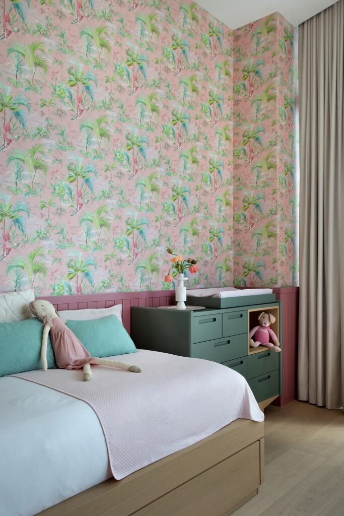 O mobiliário conecta Brasil e Itália, com peças da ETEL e Minotti que equilibram conforto macio e linhas precisas. O contraste vem das obras de arte, que inserem cor e movimento sem comprometer as vistas panorâmicas. Já os toques cromáticos remetem ao trópico de forma sutil: tons de verde-palma e amarelos aquecidos aparecem sobre a neutralidade do travertino e do carvalho.