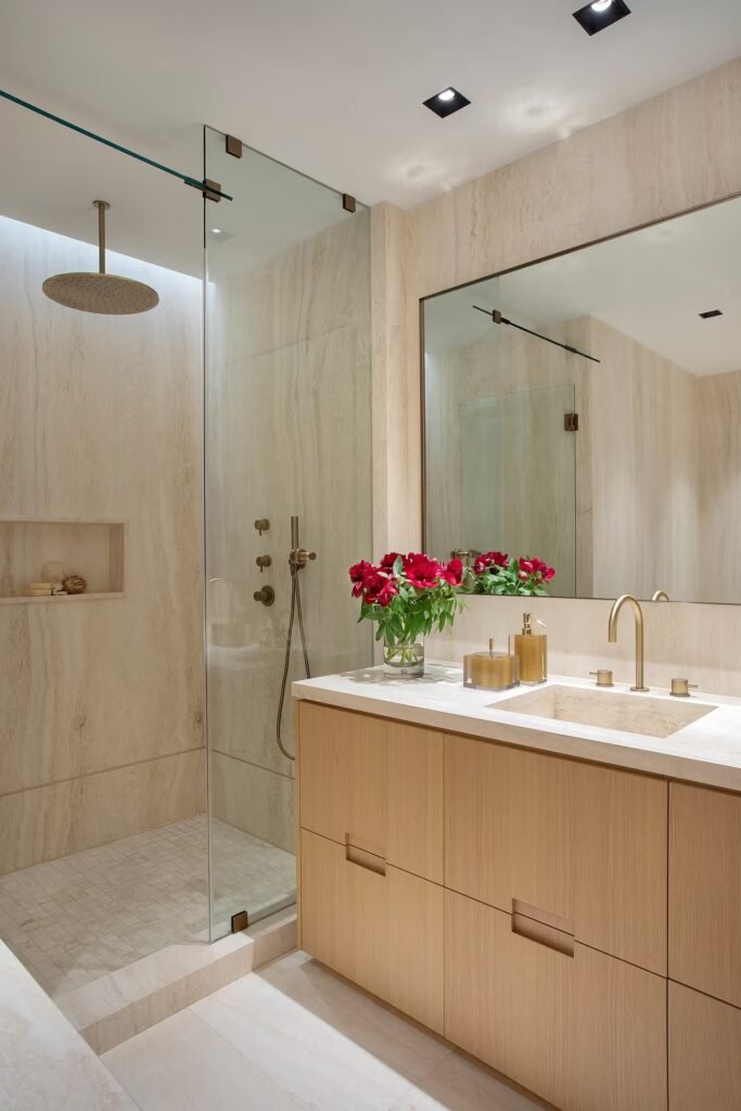 A luz da manhã percorre o travertino italiano Santa Caterina sob um céu de ripas de carvalho branco que cobre quase 200 m² do teto. Essa intervenção estrutural não só unifica os ambientes como também suaviza a acústica, ampliando a sensação de continuidade entre o oceano e o interior. Madeira, pedra, fibras naturais, bronze e latão compõem a paleta tátil, criando uma narrativa de calor e precisão sem excessos.