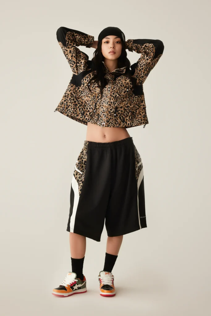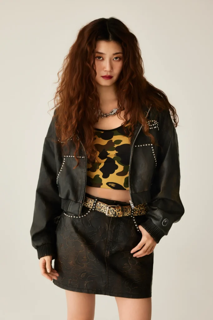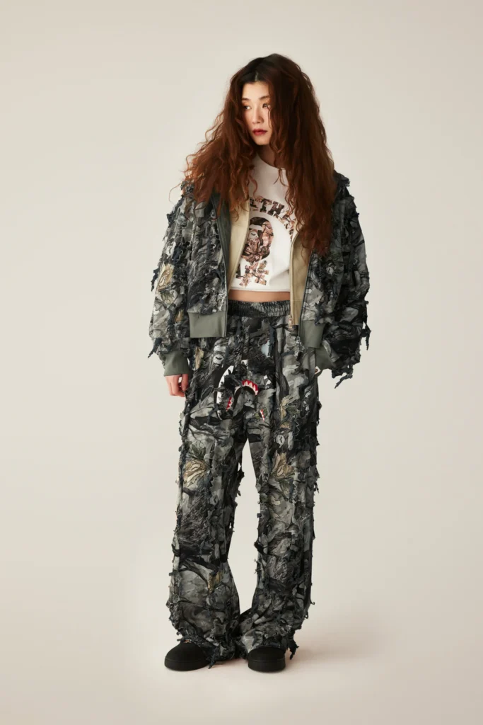 Enquanto o ART CAMO ancora a identidade visual, a maestria técnica da BAPE brilha em sua linha expandida de outerwear. A marca continua a fundir função com formas marcantes, criando peças que desafiam o compromisso sazonal entre aquecimento e estilo. Os destaques incluem a Camo-Embossed Washed Rhinestone Cropped Jacket, um item de inverno ousado e elegante, e a COLOR CAMO Reversible Down Jacket, que oferece versatilidade vibrante. A linha também apresenta jaquetas prontas para snowboard e coletes isolantes que incorporam materiais modernos, como poliéster reciclado e enchimento leve.