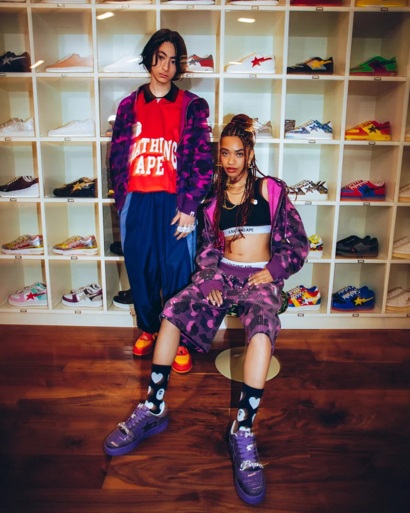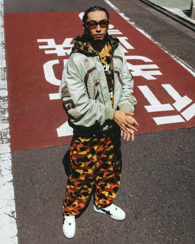 A campanha “Connect with People” ganha vida através de uma série visual vibrante que reafirma a profunda ligação da marca com a cultura jovem e a criatividade. Fotografada em duas das localidades mais icônicas da BAPEBAPE STORE Shibuya e BAPE STORE Harajuku —, a campanha captura um elenco dinâmico de rappers, skatistas e artistas multidisciplinares, cujos estilos individuais espelham a diversidade da comunidade global da marca. Com imagens urbanas e energia espontânea, a campanha ancora-se na herança do local de nascimento da BAPE, lembrando que a essência do streetwear reside na comunidade.