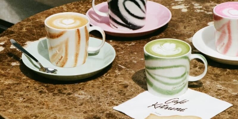 Para acompanhar o lançamento, o Café Kitsuné apresenta um menu especial por tempo limitado em suas unidades de Paris e Tóquio. Durante um mês, será possível degustar criações que refletem as cores e o espírito da coleção — como o Matcha Latte aveludado, o Black Sesame Latte torrado, o Cappuccino cremoso e o Sakura aromático —, cada um servido com doces e biscoitos personalizados com padrões que remetem ao design das canecas.