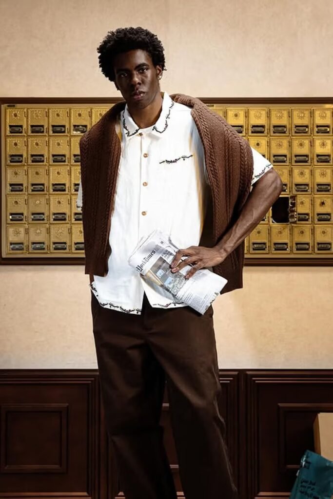 O lookbook traz DJ Rio Amor, dos Concrete Boys, vestindo uma camisa sleep-style de botões com estampa floral all-over — padrão resgatado dos arquivos de 2017 que também aparece em um hoodie com zíper. Outro destaque é o colete puffer preto, que carrega o bordado com o icônico selo “Find Some Time”.