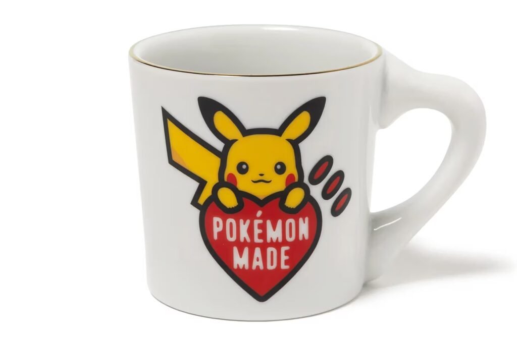 A coleção também inclui uma camiseta gráfica Unown, marcada por tipografia abstrata e minimalismo — uma assinatura da HUMAN MADE. Os acessórios, como a almofada e a caneca em formato de Pikachu, completam o lançamento com toques de humor e afeto.