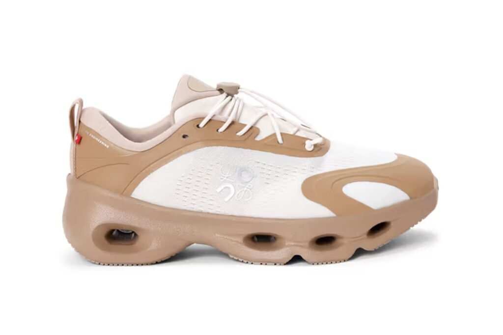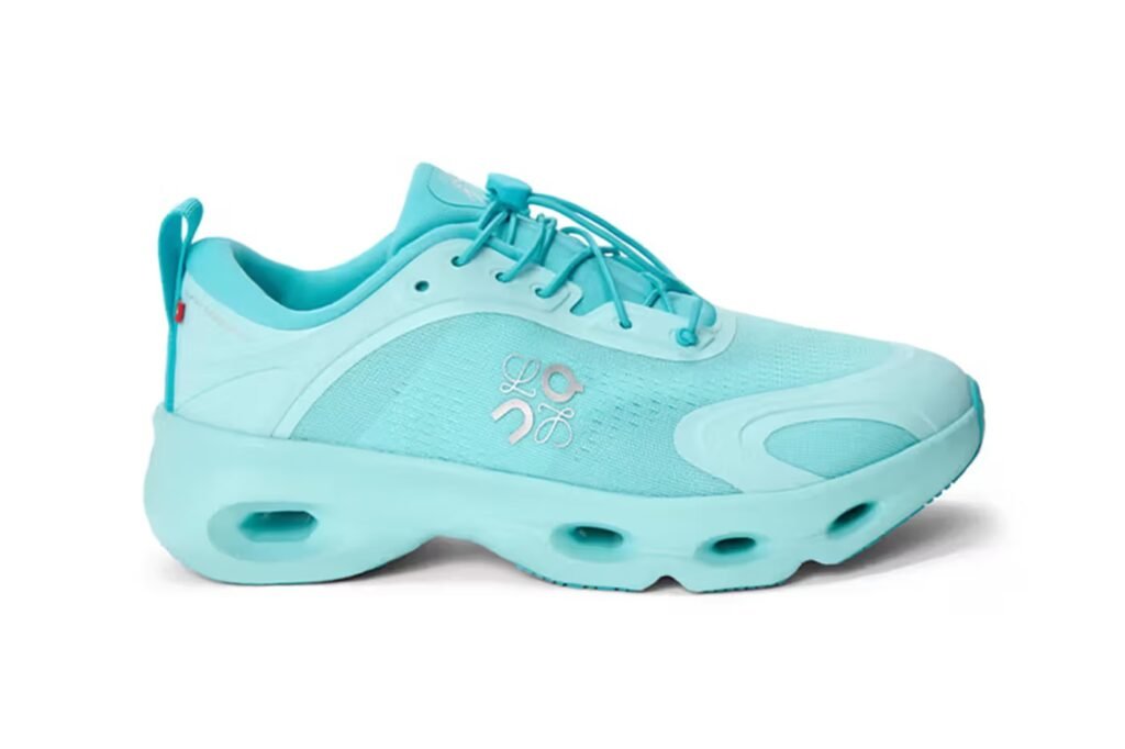 O destaque da colaboração é o Cloudsolo, o primeiro sneaker co-desenhado pelas duas marcas. O cabedal combina o mesh técnico da On com um detalhe toggle estampado com o icônico tema “pebble” da LOEWE. O solado mistura CloudTec, Helion superfoam e Speedboard, garantindo conforto, leveza e resposta dinâmica para uso diário.
