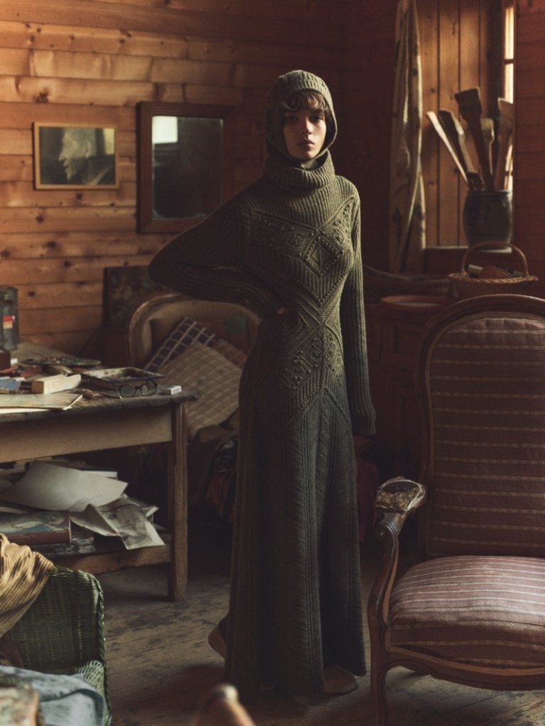 Os destaques da Loro Piana incluem o longo vestido de malha com capuz em tom oliva, a jaqueta Icer em creme suave e a bolsa Bale Softy em couro flexível. Malhas oversized com padronagem cable knit e temas em jacquard integram a tradição a formas modernas, equilibrando o aconchego rústico com a precisão da alta-costura.
