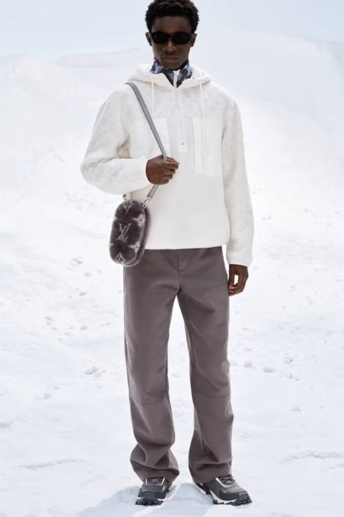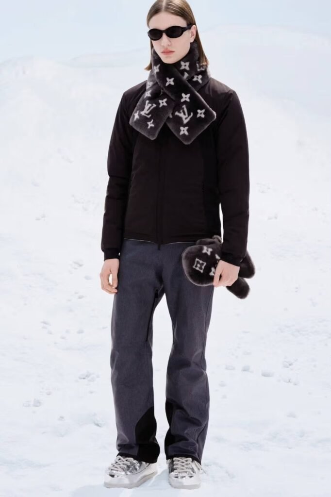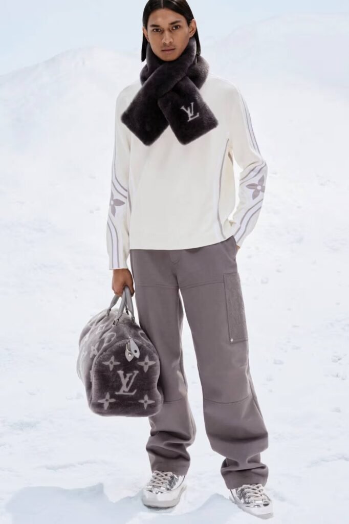 No après-ski, o luxo assume outra forma. Jaquetas de vison, trucker de shearling e sobretudos de cashmere com o Monogram Flower traduzem a elegância descontraída do pós-neve. Já o calçado brilha em novas versões: a bota LV Yeti surge em tonalidade gunmetal metálica, enquanto o icônico LV Trainer Maxi retorna com cadarços de lã — uma fusão entre conforto, design e atitude.