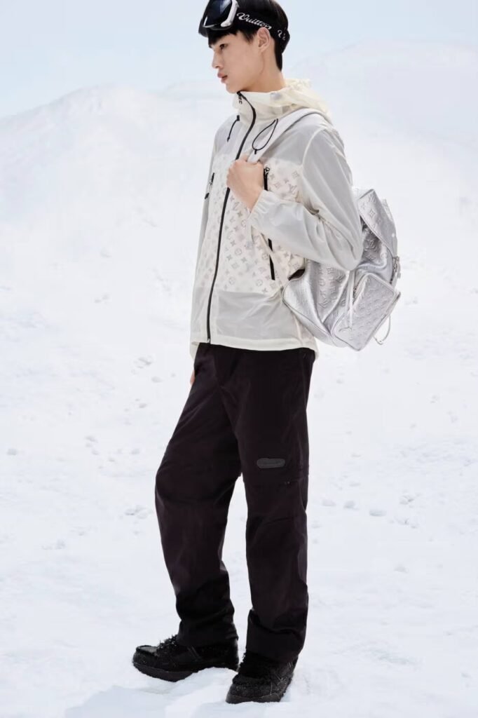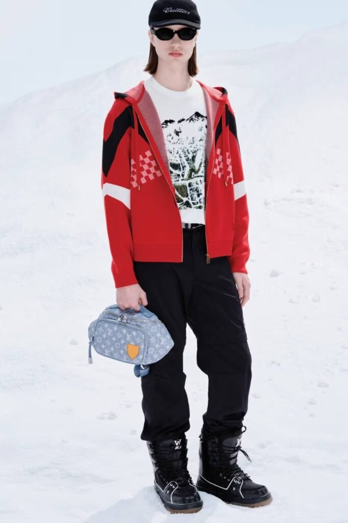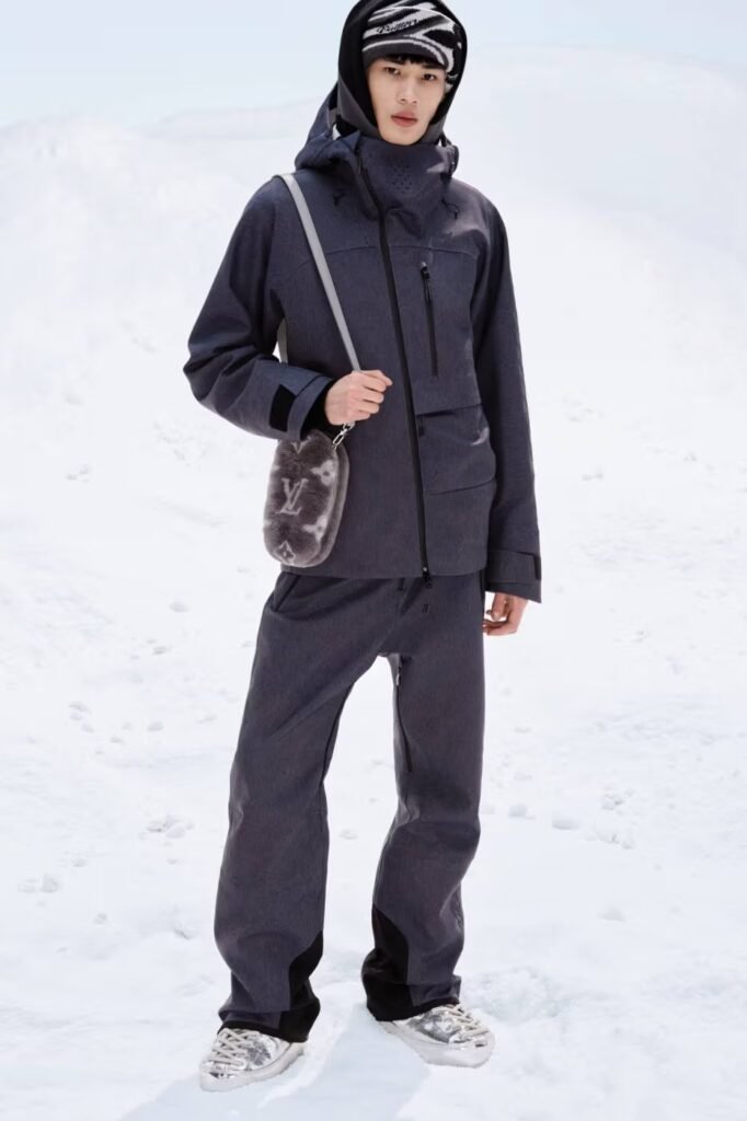 Cada uma das 12 peças da linha foi projetada para entregar funcionalidade e refinamento, com tecidos impermeáveis, sistemas de ventilação e compartimentos térmicos integrados. O macacão de esqui com o padrão LV Tartan Pixel é o grande destaque, reinterpretando os clássicos da Louis Vuitton com um toque futurista. Outro ponto alto é o macacão com efeito jeans, feito em materiais de alta tecnologia que simulam o visual do denim — um jogo visual que combina tradição e inovação.