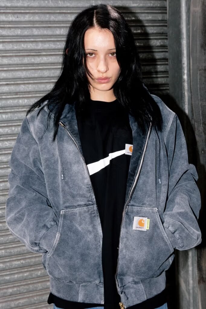 O destaque da nova cápsula é a Nike x Carhartt WIP OG Active Jacket, peça icônica da Carhartt que ganha acabamento lavado e textura envelhecida, combinando o clássico tecido de lona com o Swoosh da Nike estampado nas costas. O lançamento inclui ainda um moletom com capuz e uma camiseta com bolso, ambos com o logo da Carhartt em contraste com o símbolo da Nike, em tons que vão do neutro ao verde-limão.