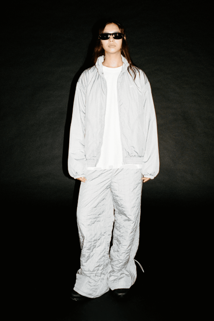 A linha de vestuário reflete o design lúdico e as proporções exageradas da Moon Boot, destacada pela Puffer Jacket oversize com acabamento reflexivo de alto brilho. A coleção se aprofunda no layering técnico com macacões justos (onesies) e segundas peles que apresentam orifícios para os polegares e padronagem de logos, além de conjuntos de tracksuit completos que consolidam a narrativa visual “space age”.