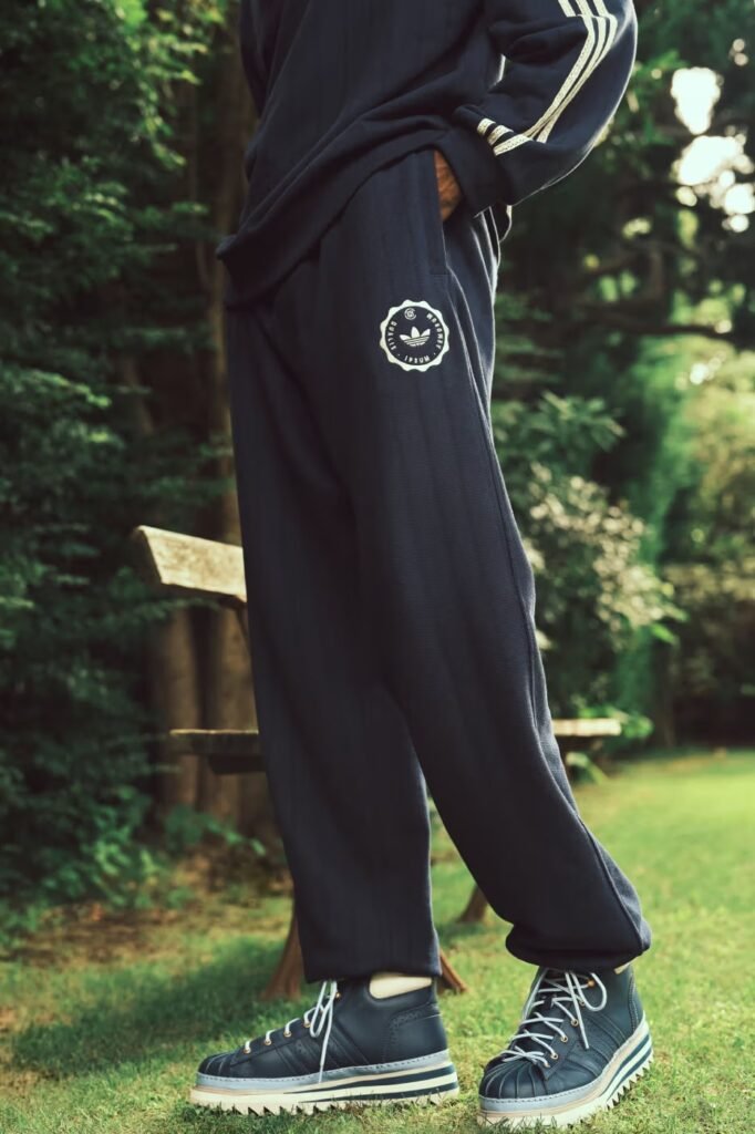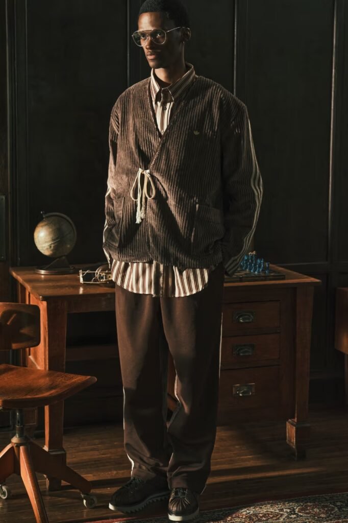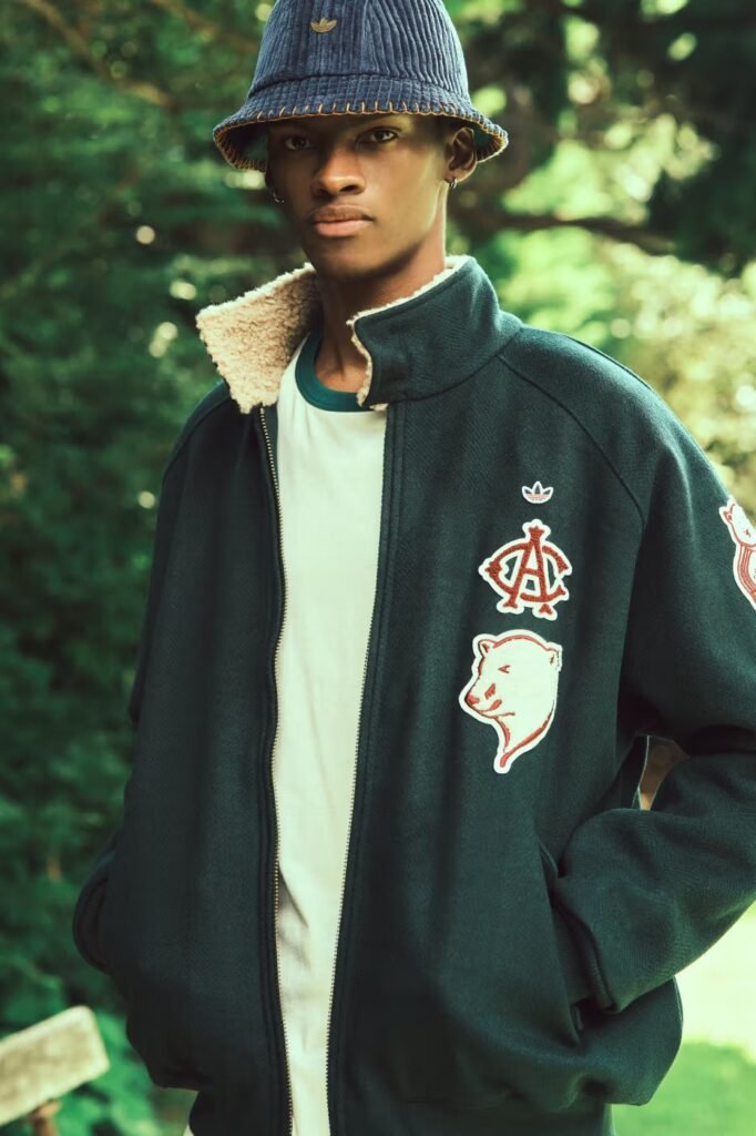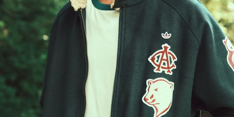 O vestuário expande a narrativa da coleção. O destaque é a CLOT Varsity Jacket, que honra a herança das jaquetas “letterman”. Ela é confeccionada em feltro herringbone (espinha de peixe) e apresenta um mascote de urso polar, uma referência divertida aos brasões clássicos de faculdade. A linha é complementada por peças como a Long-sleeve Tee, que traz gráficos ousados com os dizeres “Universitaire adidas CLOT”.