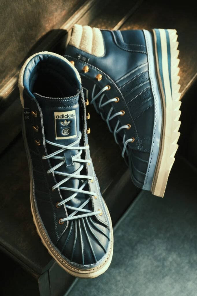 O ponto focal da coleção é o CLOT Pro Model. A silhueta transforma o icônico adidas Superstar em uma bota pronta para o inverno. Disponível nas cores Navy (azul marinho) e Brown (marrom), o modelo apresenta um cabedal em couro premium, cadarços de corda (rope laces) e uma robusta sola utilitária serrilhada (sawtooth utility sole). O design é finalizado com ilhós dourados (gold-tone eyelets) e a marca sutil da CLOT, unindo artesanato e intercâmbio cultural.