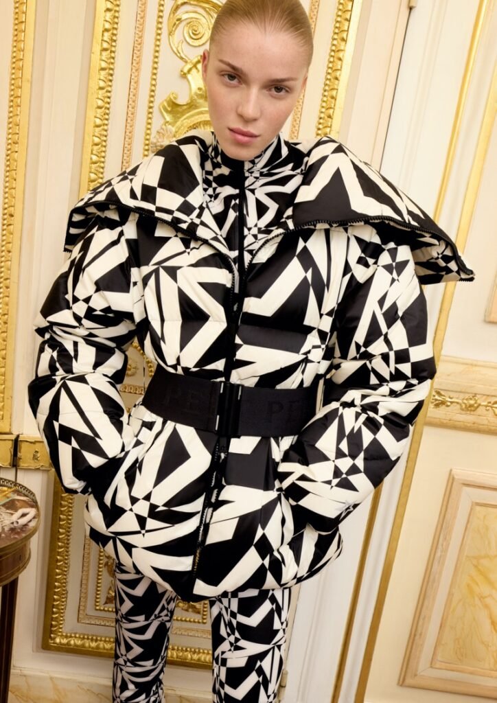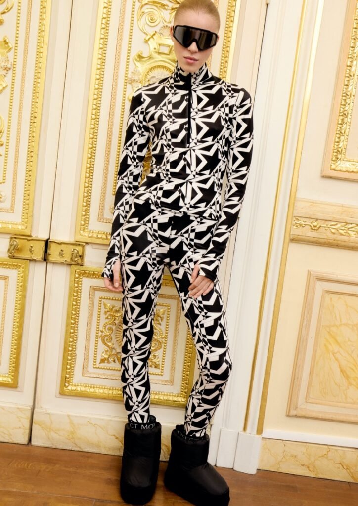A coleção equilibra design técnico com uma vantagem fashion-first , incluindo jaquetas com enchimento de plumas, malhas (knitwear) e acessórios. A paleta de cores foca nos tons característicos da Perfect Moment — preto, branco e prata — mas adiciona toques festivos de borgonha (burgundy) e azul gelo (icy blue). A campanha, pura e dramática, evoca um clima de “chalé de esqui de alta moda encontra um palácio parisiense” , apresentando trajes de esqui em salões e até cães Samoieda com coleiras rosa pink.