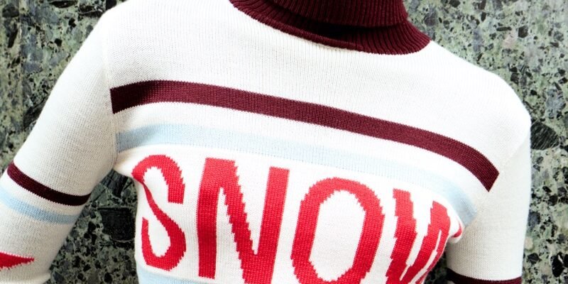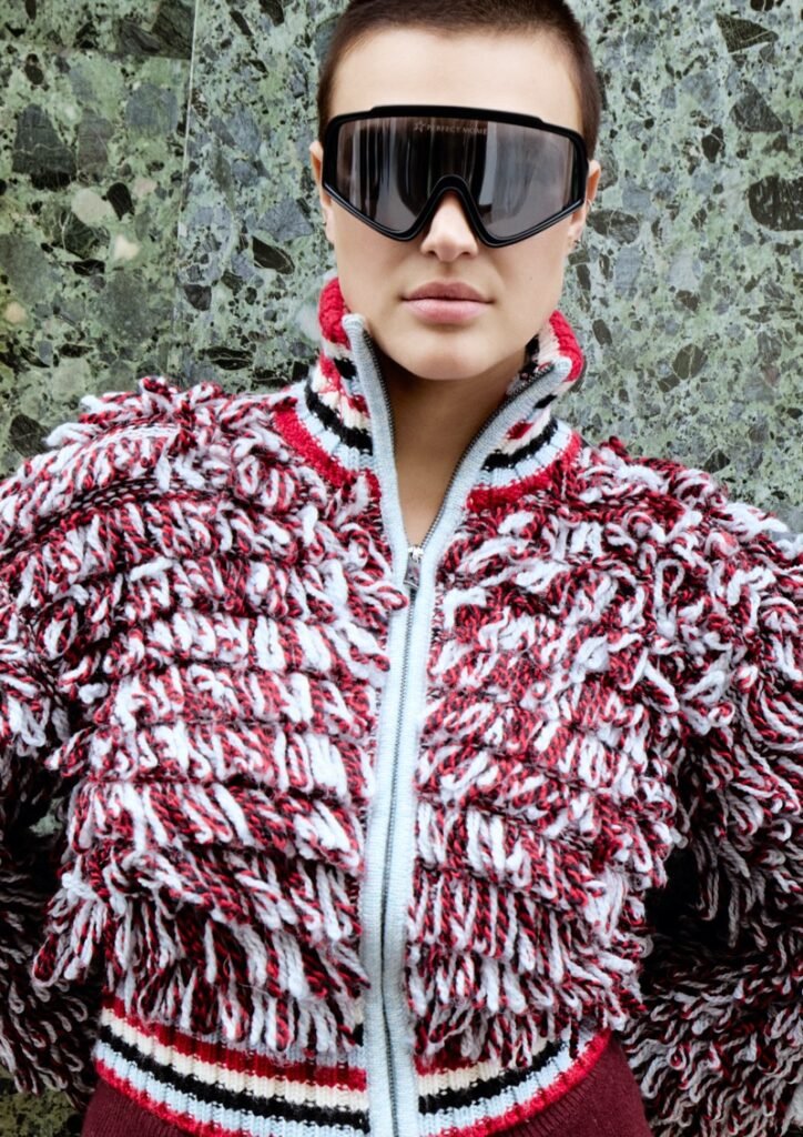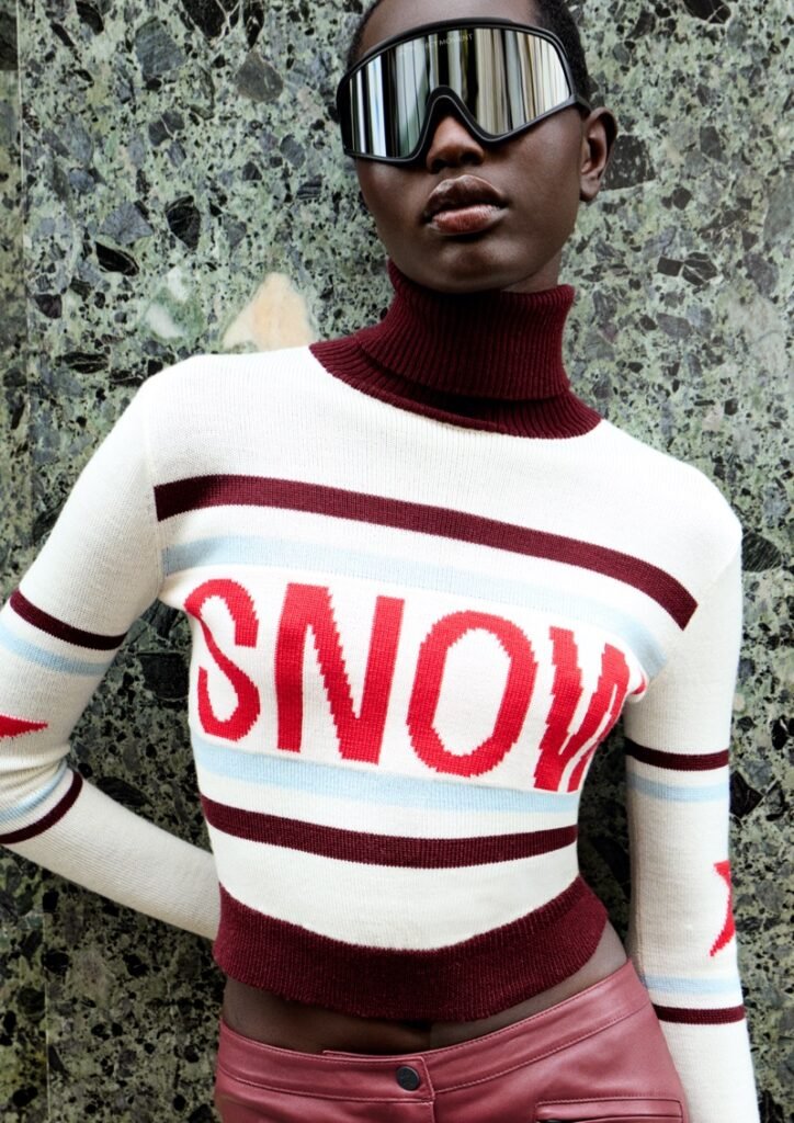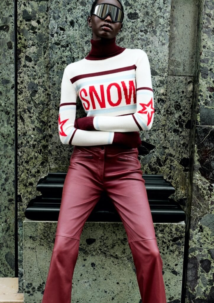 Entre as peças de destaque estão a jaqueta puffer de pele falsa borgonha, com corte cropped e cintura marcada, e calças de couro borgonha que reinterpretam a silhueta de esqui com um leve bootcut e zíper na panturrilha. A linha também inclui puffers com estampa de estrela, um cardigã loop-knit , um conjunto de malha borgonha com meias acima do joelho e acessórios como moon boots altas de pele falsa e gorros pom-pom.