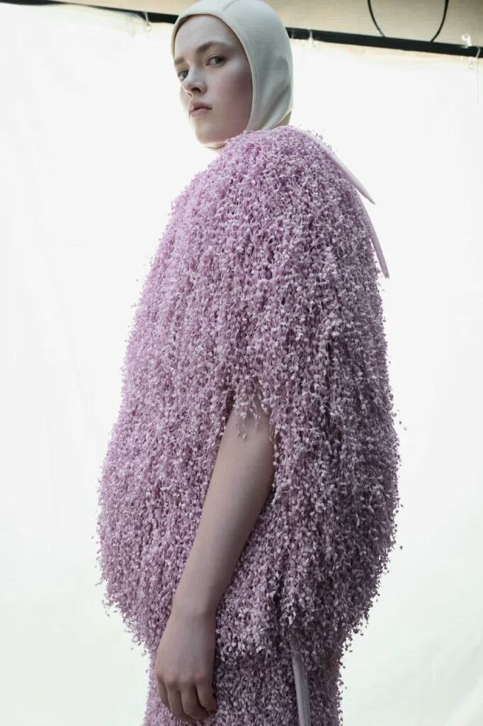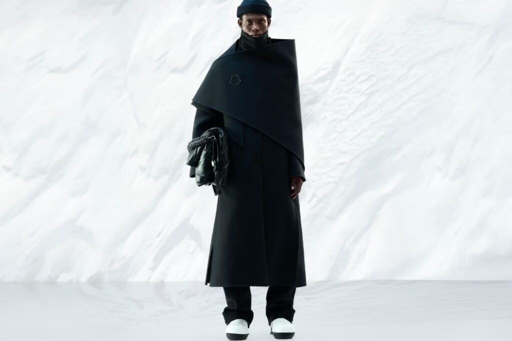 A coleção é caracterizada por uma sensação de “redondeza” e camadas volumosas, inspiradas nas curvas de picos nevados, folhagens densas e seixos lisos, materializando-se em jaquetas esculturais, cardigãs acolchoados e saias em formato de cúpula. Materiais naturais refinados, como lã dupla macia, sarja de algodão lavada leve e uma inovadora lã de pelo longo, conferem uma qualidade orgânica às peças, muitas vezes ocultando a tecnologia de nylon e plumas característica da Moncler sob formas de alfaiataria semi-formal. Até mesmo a icônica puffer jacket foi recriada em algodão para renderizar sua forma volumosa de maneira mais orgânica.
