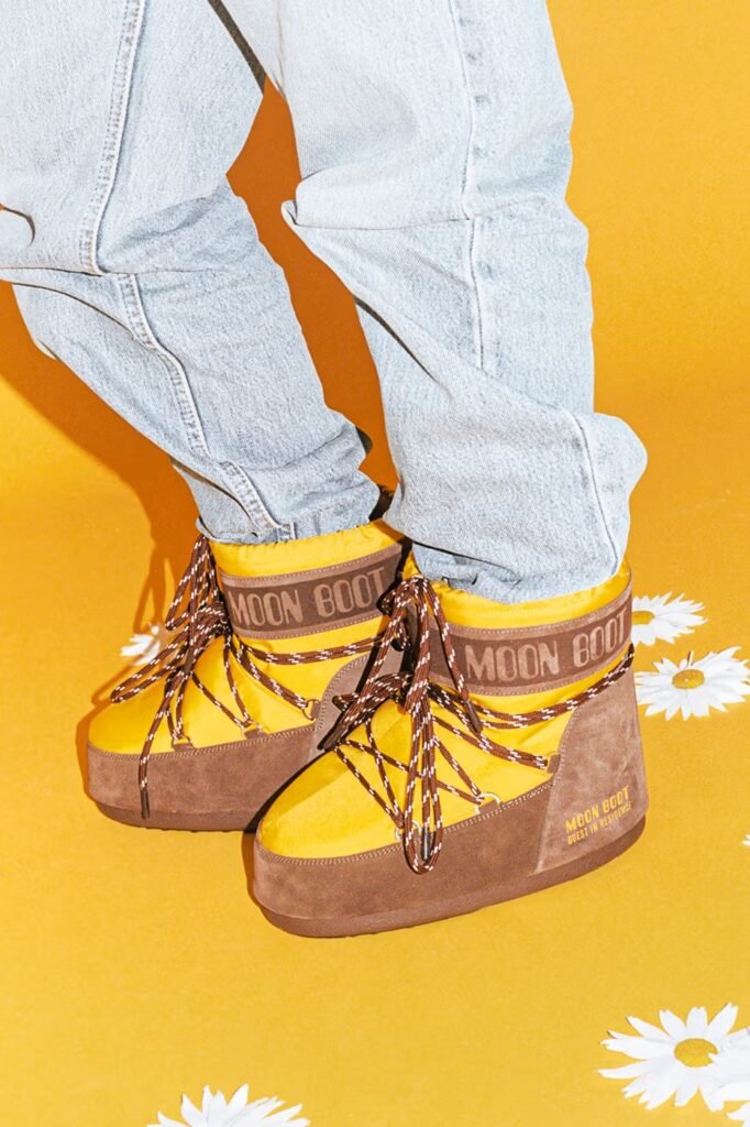 Cada estilo usa a silhueta de assinatura da Moon Boot, disponível nas opções high (cano alto), low (cano baixo) e slip-on. Os modelos mantêm o formato instantaneamente reconhecível da marca, mas são enriquecidos com a estética da GIR, incluindo estampas e paletas de edição especial. Detalhes extras de design (“flair”) são adicionados, como “bead charms” (pingentes de contas), cadarços coloridos, e detalhes em camurça e pele sintética (faux fur).