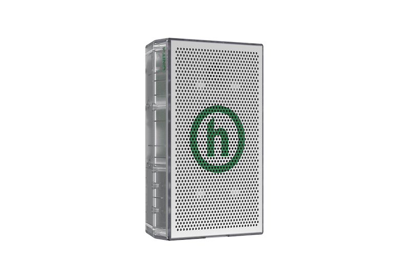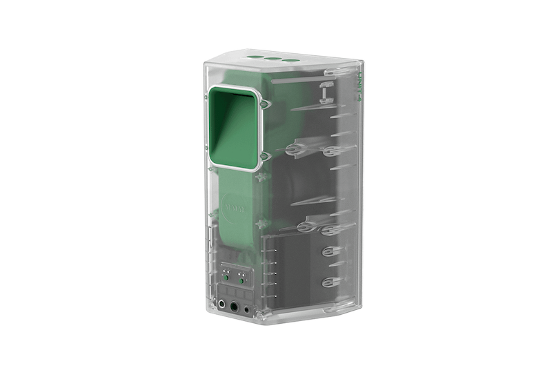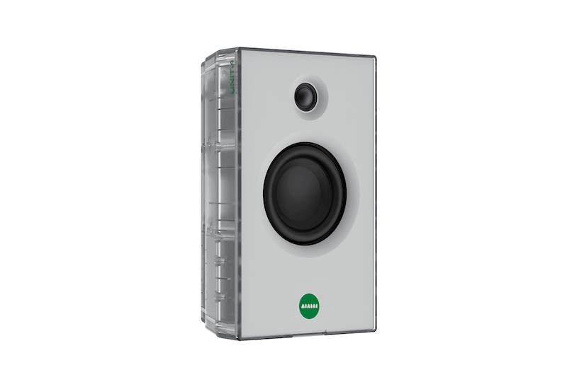 Complementando a experiência, os alto-falantes UNIT-4 Hidden Edition estendem o conceito para um formato escultural e quase totalmente transparente nos painéis superiores e laterais. As grades frontais em metal branco contrastam com o corpo translúcido, enquanto o logotipo e os botões em verde mantêm a identidade visual da colaboração.