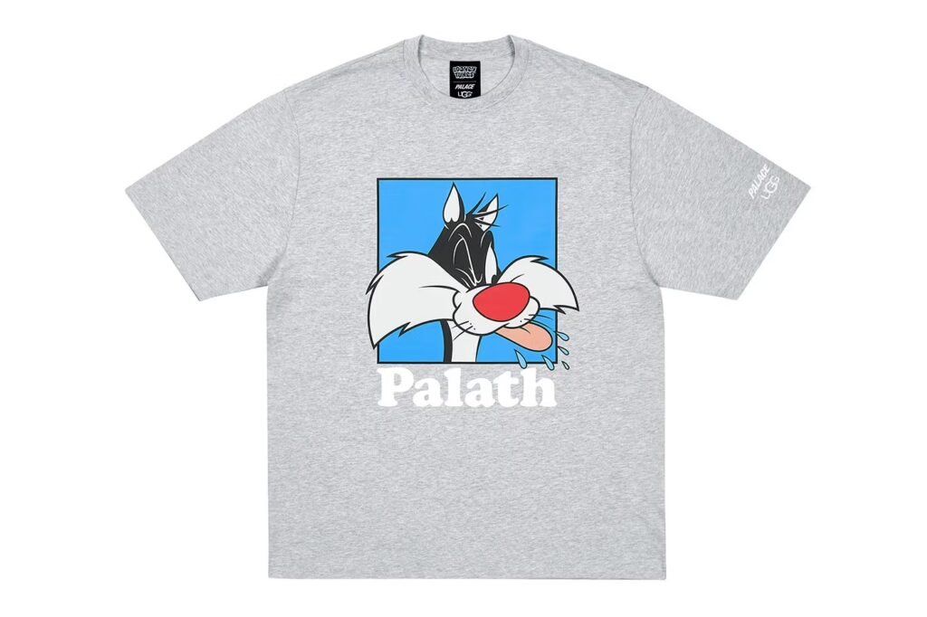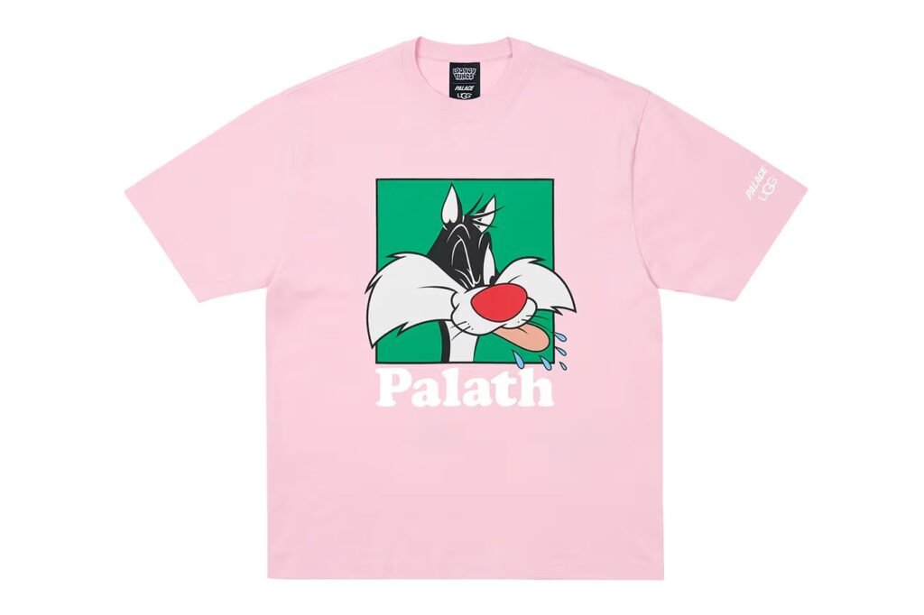 A cápsula se expande para o vestuário com hoodies, camisetas e joggers com gráficos oversized, mas o grande destaque é a Wool Varsity Jacket. A peça preta apresenta o logo da UGG reimaginado em cores primárias, com detalhes em vermelho, azul e verde nas mangas alternando imagens dos personagens. Nas costas, uma estampa de Frajola com a língua de fora ganha a companhia da palavra “Palath” bordada logo abaixo — uma referência direta e bem-humorada à dicção inconfundível do gato.