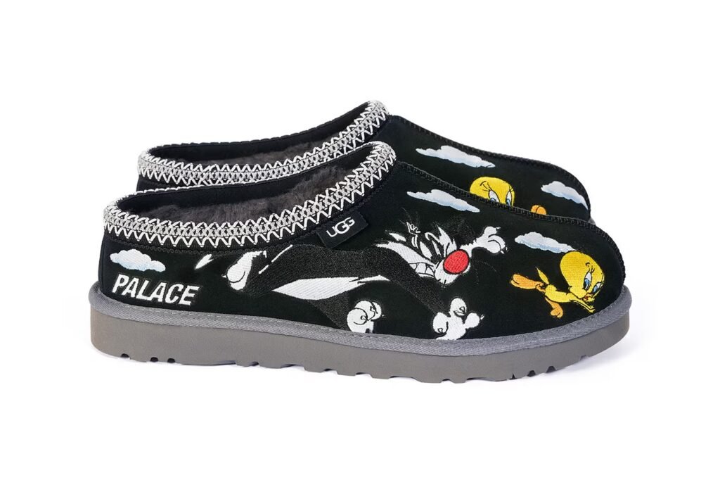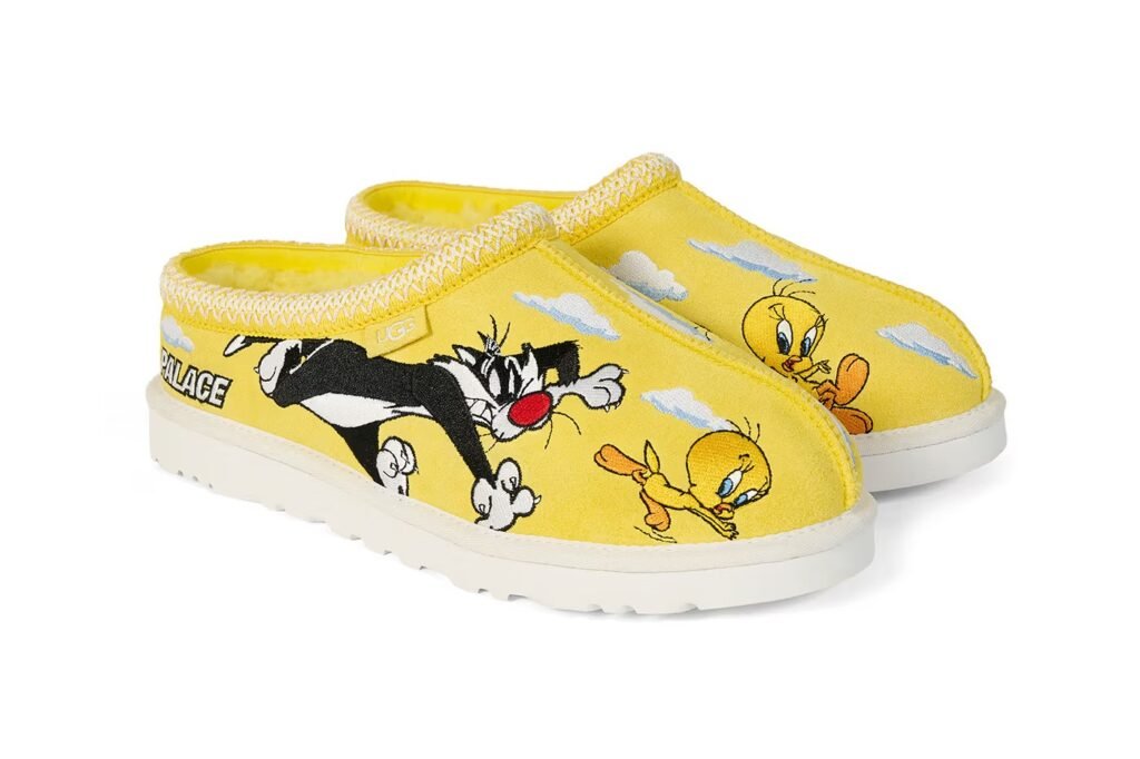 Com lançamento agendado para 5 de dezembro, a coleção reinterpreta duas silhuetas clássicas da UGG: a Ultra Mini e a Tasman. Tanto a UGG Palace Ultra Mini quanto a UGG Palace Tasman chegam nas colorways Chestnut, Black e um Yellow vibrante aprovado pelo próprio Piu-Piu. Os modelos exibem bordados em múltiplas camadas que capturam a incansável perseguição entre os astros da animação, posicionados entre nuvens costuradas e o logotipo da Palace, tudo isso sem abrir mão do forro macio original da UGG.