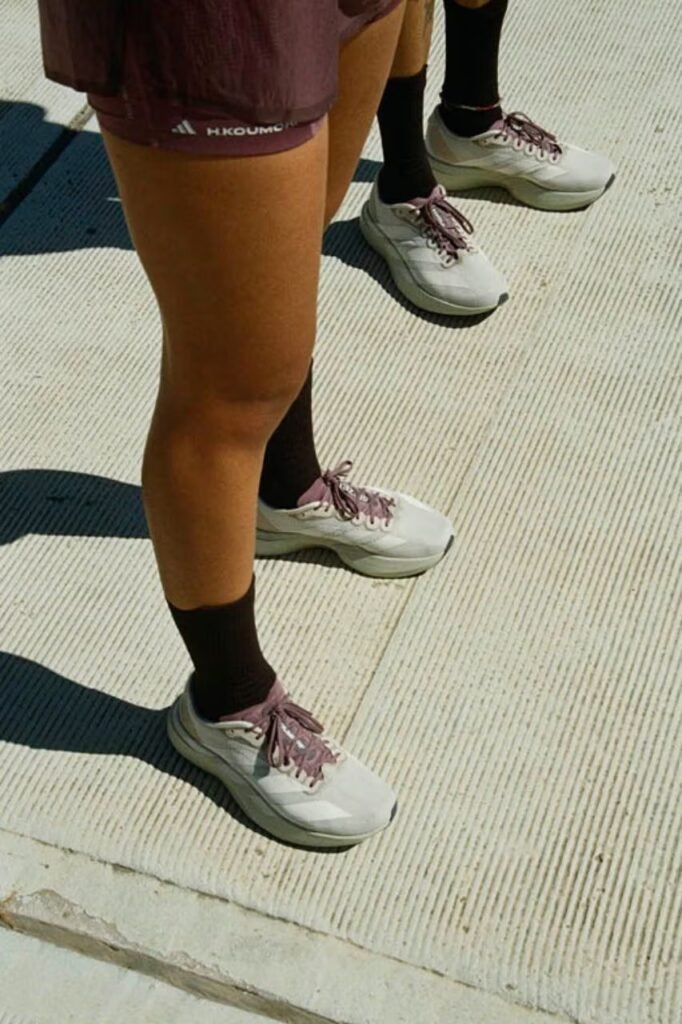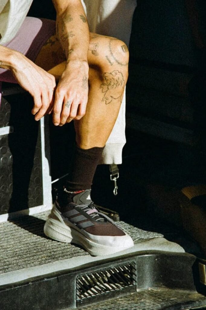 Embora o vestuário estabeleça uma base visual forte, o verdadeiro destaque da coleção reside nos calçados. A dupla apresenta o inédito Adizero Evo SK HL, uma silhueta construída para velocidade e retorno de energia, ao lado de uma edição especial do Ultraboost 5 HK, focado em conforto e recuperação. Ambos os modelos incorporam a identidade visual da collab, mesclando bases em cinza e marfim com toques sutis de roxo que adicionam profundidade sem sobrecarregar o design.