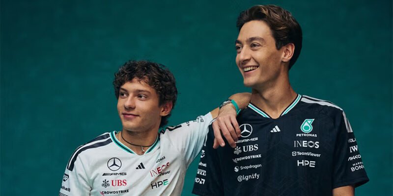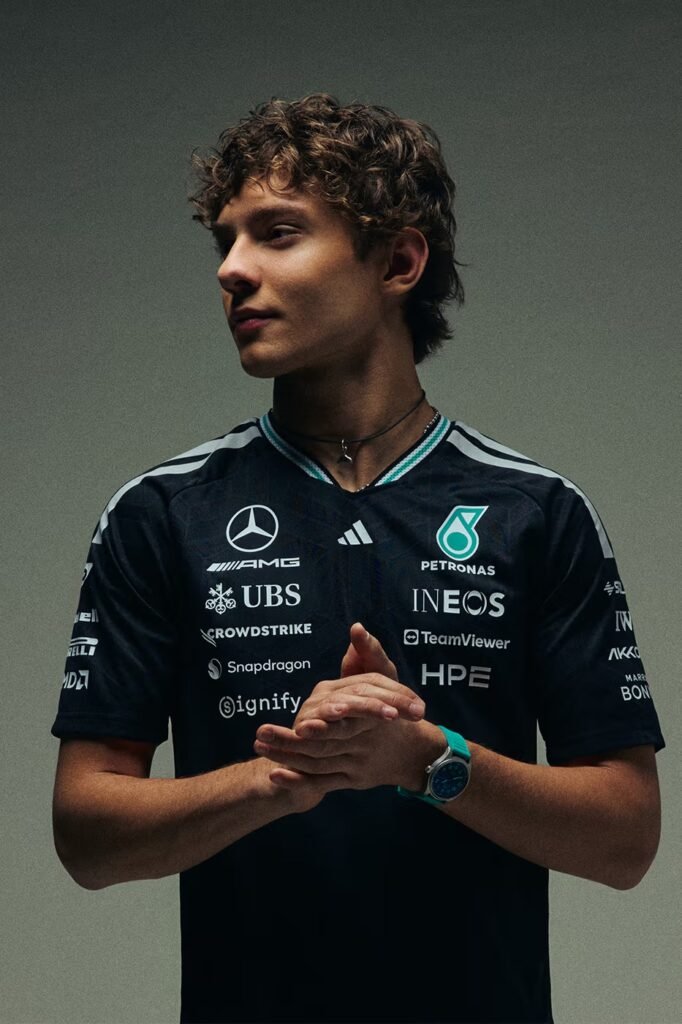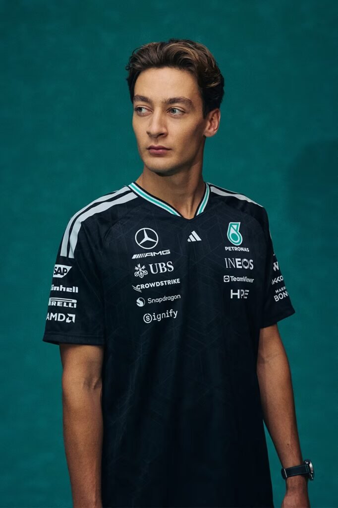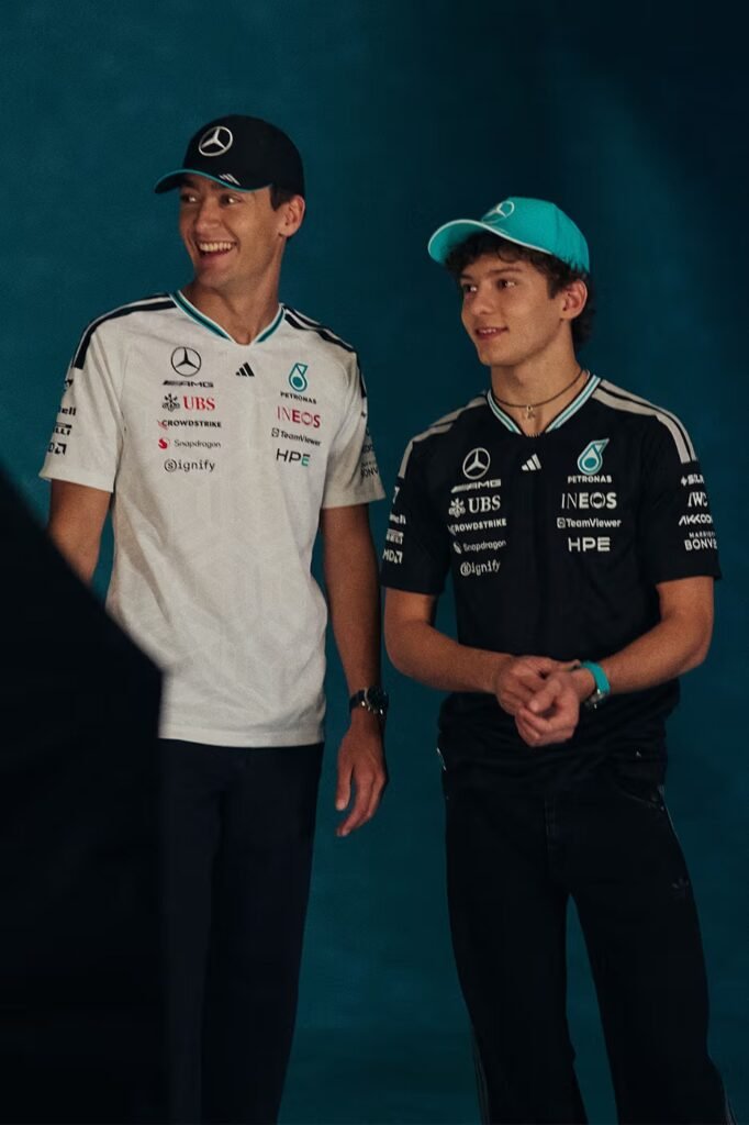 Estrelado por George Russell e Kimi Antonelli, o lançamento é liderado pela camisa autêntica de piloto, que utiliza a tecnologia CLIMACOOL e um acabamento padronizado para garantir conforto no paddock.