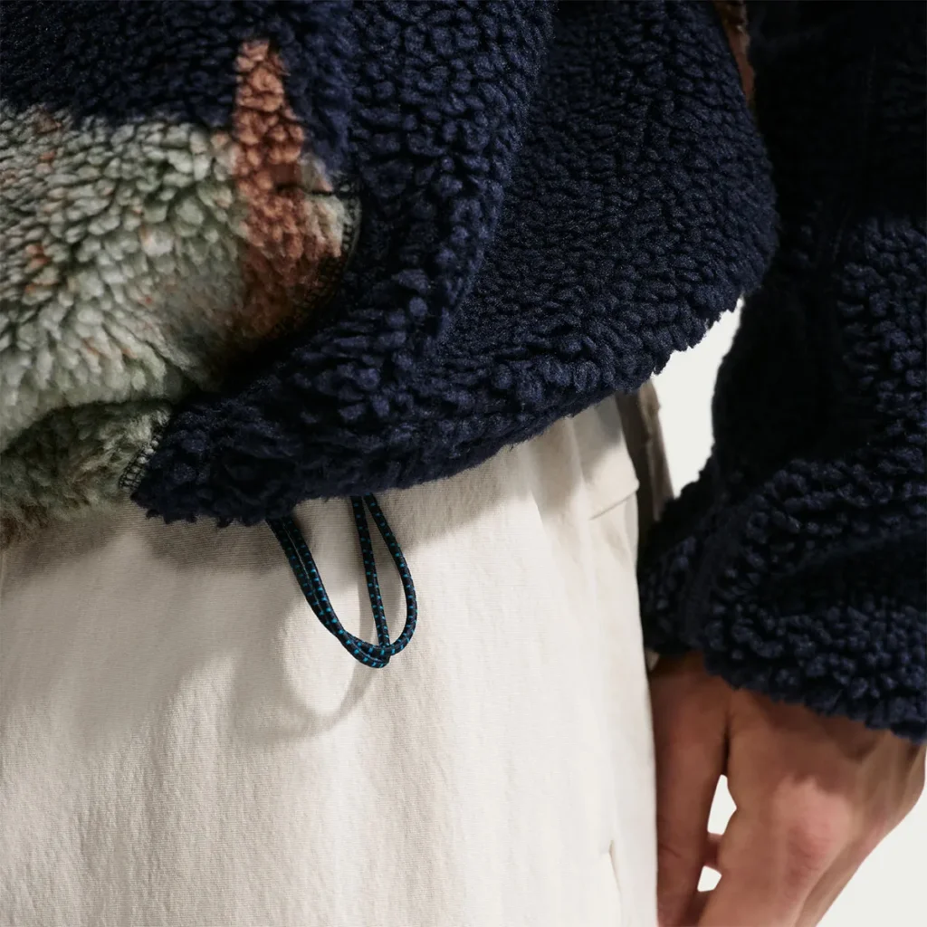 Para quem prefere algo mais discreto, há um moletom crewneck com um intrincado bordado da águia em branco sobre branco. A peça mais inusitada e técnica, no entanto, é uma saia Therma-FIT ADV com a mesma estampa do fleece, projetada com a funcionalidade dupla de servir como um cobertor de recuperação pós-competição.