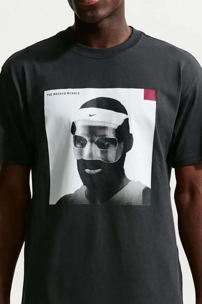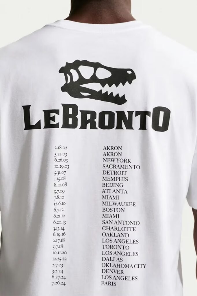 Expandindo para sua carreira posterior, a coleção mergulha em capítulos mais controversos e cruciais. Destaques incluem a camiseta “Good Intentions”, referenciando sua transição para o Miami Heat, e o design “Masked Menace”, que relembra seu jogo de 61 pontos usando uma máscara protetora. O drop ainda toca em seu impacto cultural e domínio na pós-temporada com “Shut Up And Dribble” e “LeBronto”, garantindo que cada fase de sua jornada seja representada.