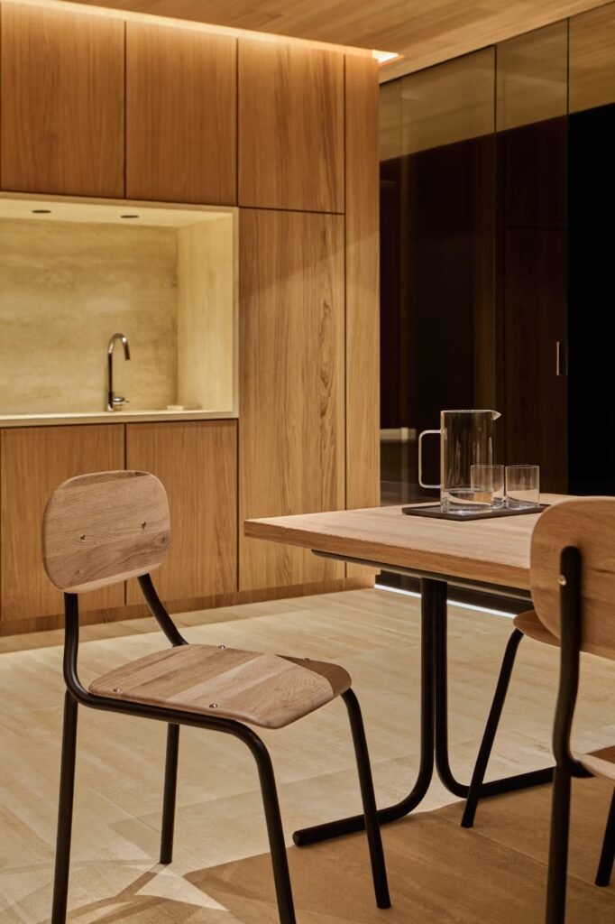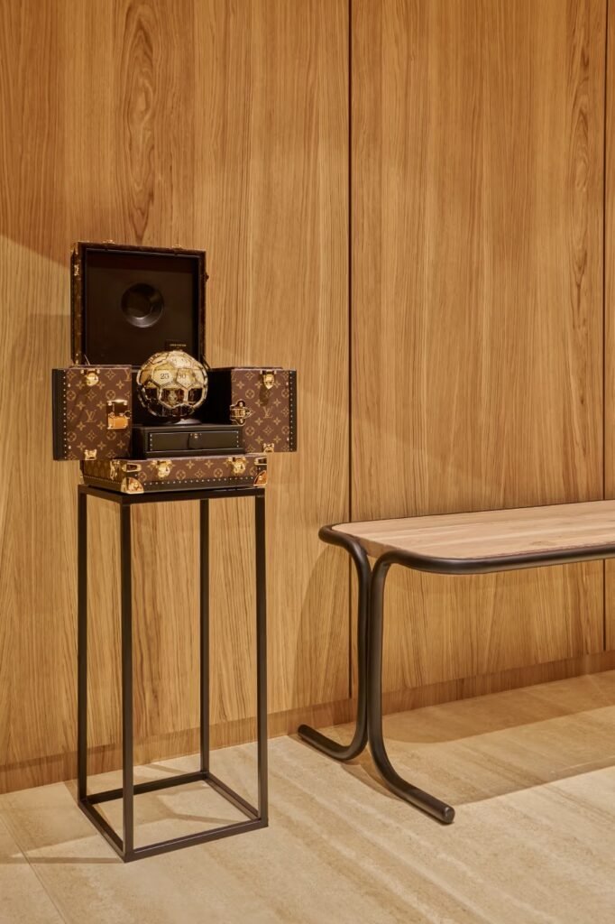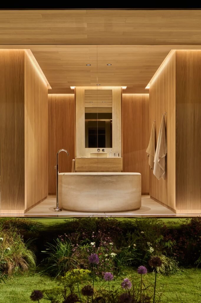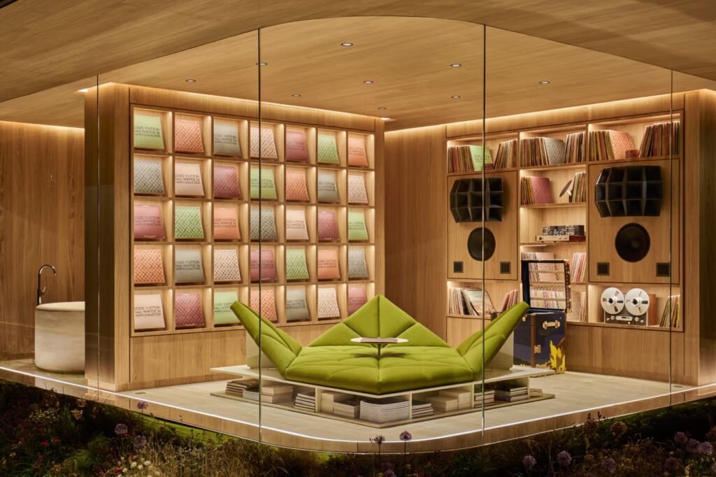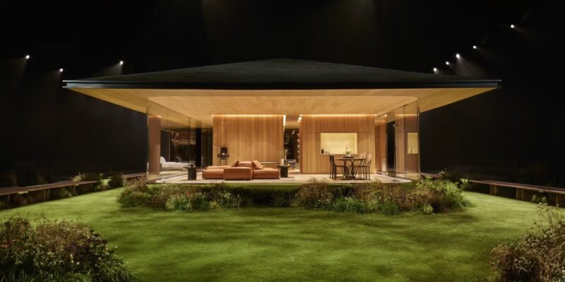 Inspirada na forma orgânica de uma gota d’água, a estrutura de madeira é definida por paredes de vidro curvas que circundam a casa, dissolvendo as fronteiras entre os espaços internos e o jardim externo sob um imponente telhado piramidal. O interior foi mobiliado com a coleção “Homework”, desenhada por Pharrell sob o princípio de “10% de imperfeição” para celebrar o toque humano, e a atmosfera foi completada por uma fragrância personalizada criada pelo mestre perfumista Jacques Cavallier Belletrud.