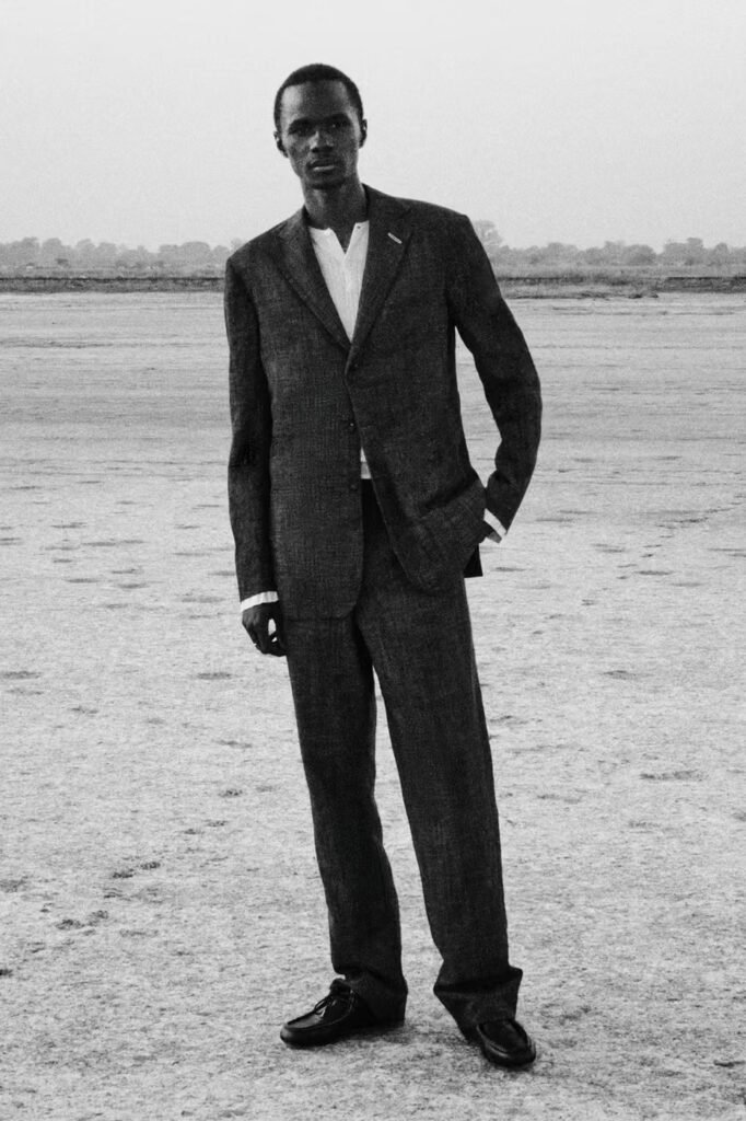 As parcerias estratégicas continuam centrais ao domínio técnico da marca: a linha adidas Originals introduz o tênis Karintha em crocodilo e um novo perfil BW Army, enquanto um smoking de linho índigo da Anderson & Sheppard e malhas da John Smedley completam a proposta, celebrando o design modernista como um otimismo transcultural unicamente renderizado.