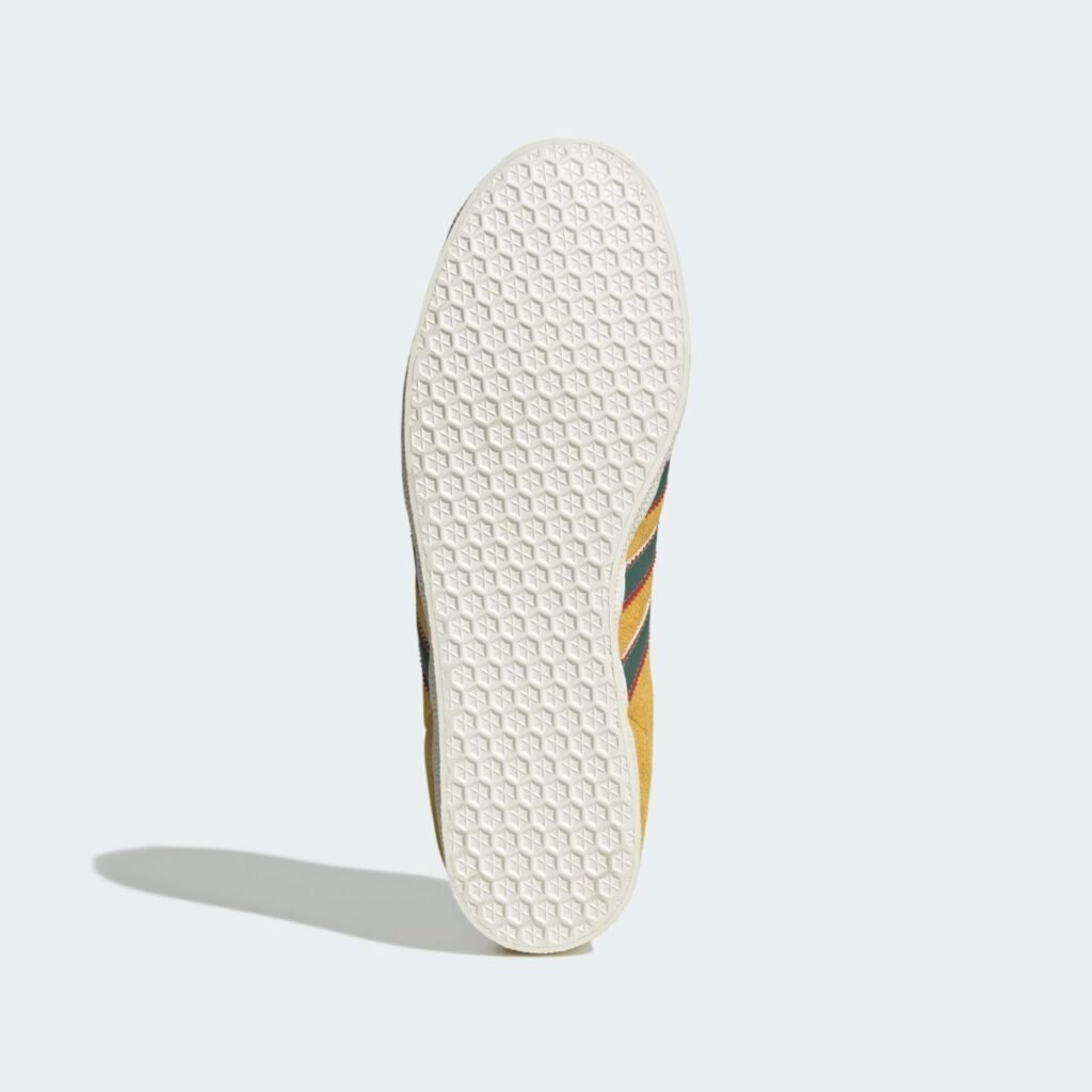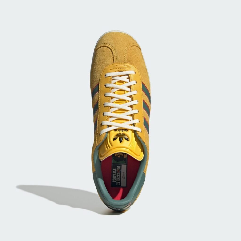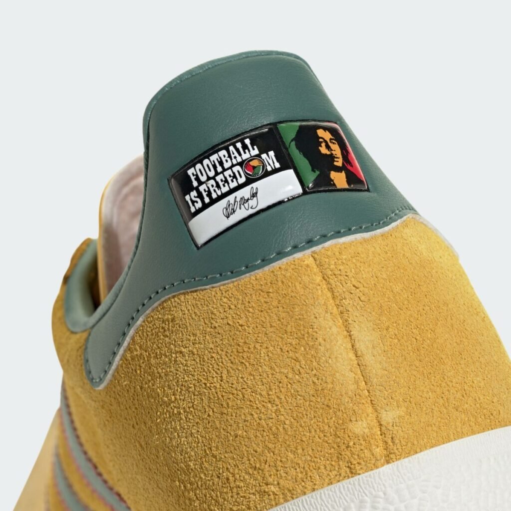 Nos calçados, a colaboração foca no icônico Gazelle, rebatizado carinhosamente por entusiastas como adidas “Bob“. O tênis apresenta cabedal em camurça mostarda suave, as três listras em verde com bordas vermelhas e a frase “Football is Freedom” gravada no calcanhar ou na língua. Além do Gazelle, o modelo SL 72 — um dos favoritos de Marley em vida — também recebeu uma versão especial.