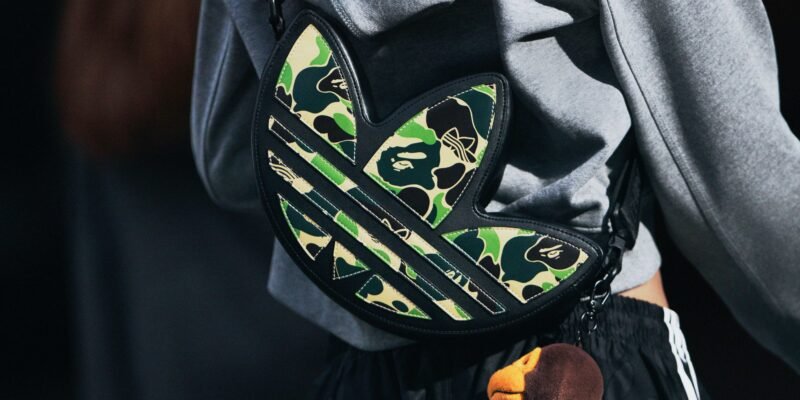 Nos pés, o foco recai sobre três silhuetas distintas: o adistar HRMY BAPE, o Samba BAPE e o Campus 00’s BAPE. O adistar HRMY apresenta cabedal em ABC CAMO Green com detalhes refletivos e entressola estampada com os tradicionais dentes de tubarão da marca japonesa. O Samba surge em uma nova colorway que dá continuidade ao modelo introduzido na temporada passada, enquanto o Campus 00’s aparece em preto, destacando o gráfico BAPESTA branco na lateral e as três listras no lado medial.