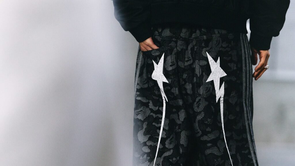 O vestuário é ancorado por duas camisas de destaque que funcionam como peças de colecionador. A primeira é um topo de mangas longas com gola e estampa que remete ao denim, decorado com o gráfico BAPE STA. A segunda revisita o design da seleção nacional do Japão dos anos 90, incorporando chamas originais da BAPE nas mangas e a personalização “BAPE 93” nas costas, uma referência ao ano de fundação da etiqueta de Tóquio. A oferta de vestuário é complementada por camisetas gráficas APE HEAD, o Trefoil ABC CAMO Green Shark Hoodie, bermudas jeans tipo jorts com tema de tubarão e calças parachute em jacquard camuflado.