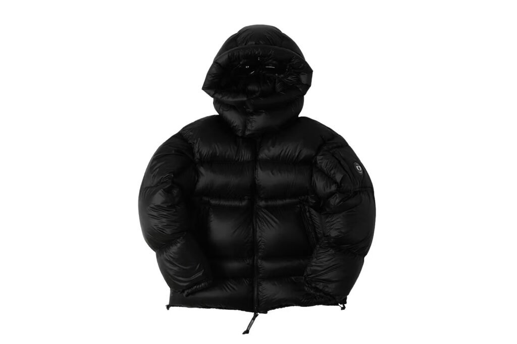 O ponto central da coleção é a D.D. Shell Jacket, uma peça que demonstra a maestria técnica da marca em isolamento térmico. Utilizando o processo de injeção “Direct Down” (penugem direta), a jaqueta garante aquecimento sem comprometer a fluidez da silhueta, eliminando as barreiras tradicionais de costura. Complementando o vestuário, o Shearling Goggle Hat reinterpreta o acessório mais icônico da marca — o capuz com lentes — utilizando a textura rica e tátil da pele de carneiro (shearling). Essa escolha de material ressalta o tema da coleção de superfícies texturizadas, oferecendo uma atualização luxuosa e rústica a um clássico do sportswear.