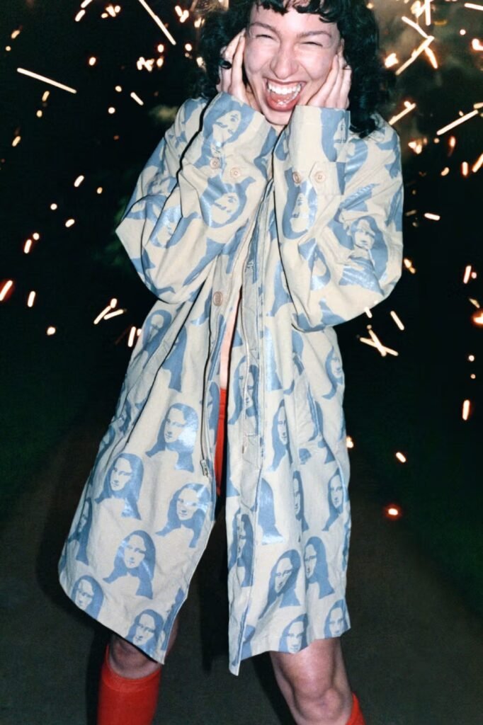Acessórios como bonés, lenços e bolsas estendem o alcance da coleção, enquanto detalhes lúdicos e slogans provocativos reforçam a identidade da marca. A paleta transita entre tons neutros sóbrios e explosões vibrantes de cor, sublinhando o tema da busca pela excentricidade na rotina.