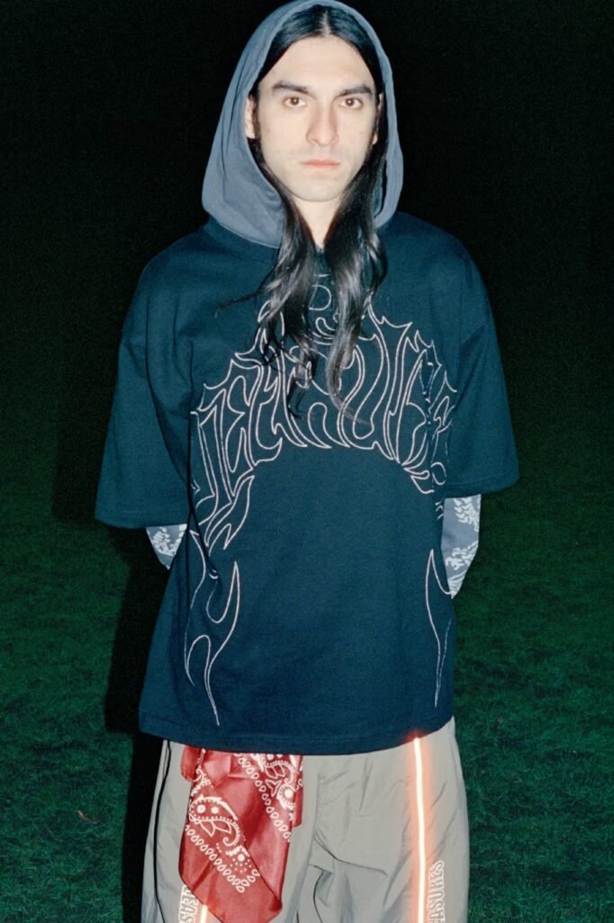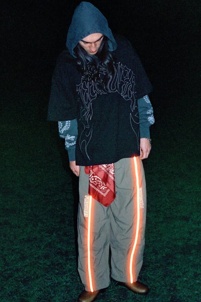 Os principais destaques incluem camisetas gráficas, hoodies oversized e jaquetas inspiradas em workwear, ao lado de peças em denim e calças de agasalho que enfatizam cortes relaxados.
