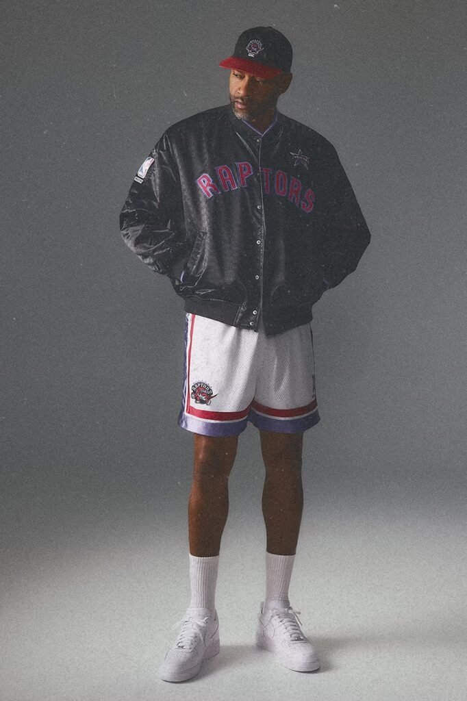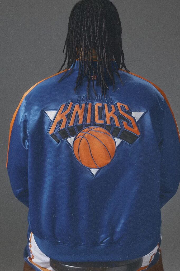 A linha de vestuário é encabeçada por jaquetas bomber de cetim premium com bordados das equipes, além de camisas Mesh Leon e shorts combinando que replicam o visual das quadras do início dos anos 2000. A “silhueta heroica” da coleção é a Leather Bomber Jacket, desenvolvida em colaboração contínua com a AVIREX, apresentando diversos emblemas de times e o co-branding Kith All-Star.