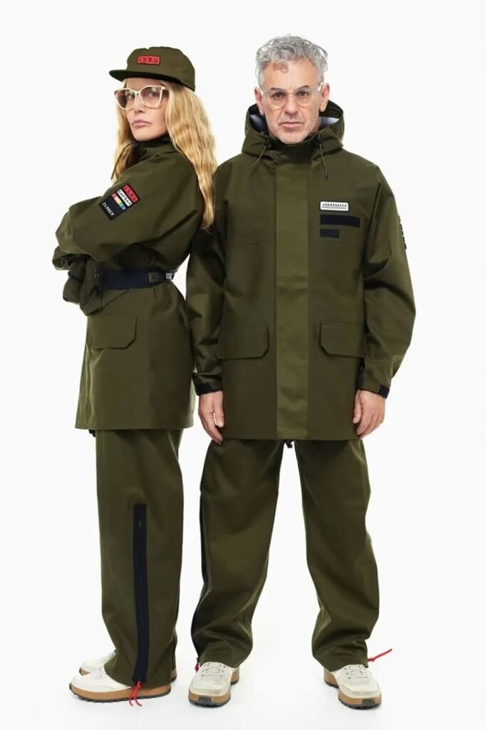 Abaixo das camadas de proteção, a coleção oferece itens básicos versáteis. A Space Camp Shirt e os Space Camp Shorts são construídos com tecnologias de secagem rápida e forro, unindo o universo do activewear aos uniformes de trabalho. Um terno de duas peças e calças utilitárias completam o vestuário, todos apresentando a assinatura manuscrita de Sachs e frases motivacionais impressas diretamente nas peças, reforçando a disciplina e a intencionalidade do projeto.