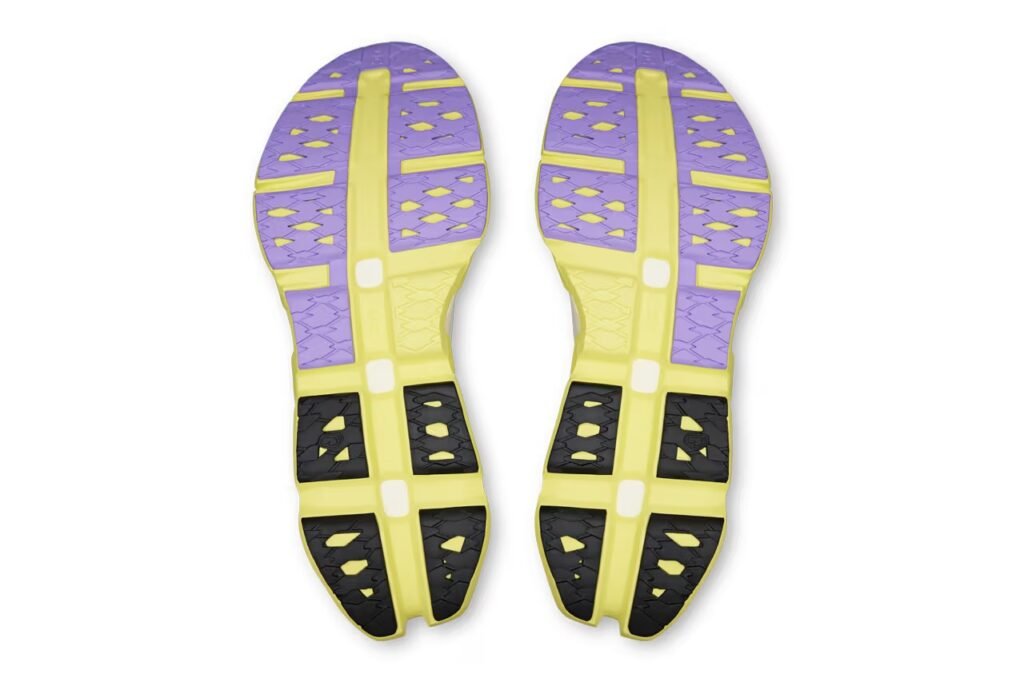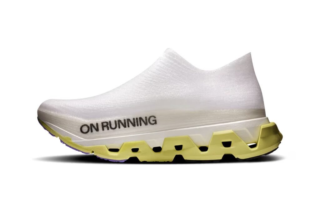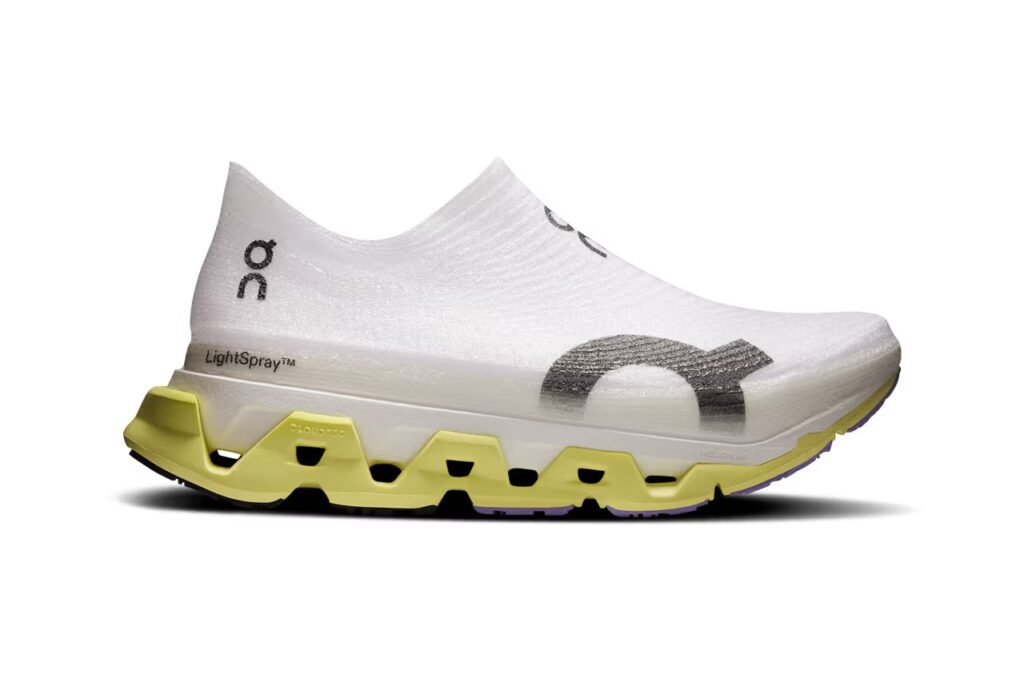 O grande diferencial do modelo é a redução drástica de peso e componentes. Com apenas oito peças em sua estrutura total — dois elementos de entressola, cinco componentes de borracha e um cabedal único — o tênis pesa aproximadamente 205g, sendo 25% mais leve que as versões anteriores. O cabedal LightSpray é moldado com precisão milimétrica diretamente na forma, eliminando costuras e sobreposições. O visual aposta no minimalismo: base branca com branding em preto sobre o icônico solado amarelo dotado da tecnologia CloudTec.