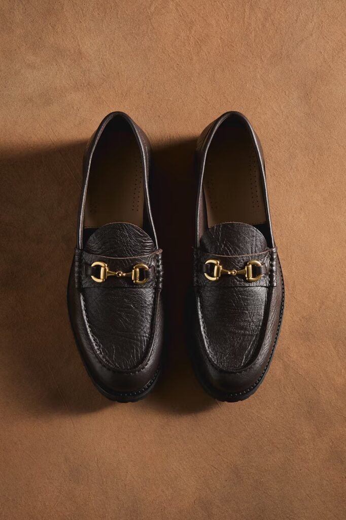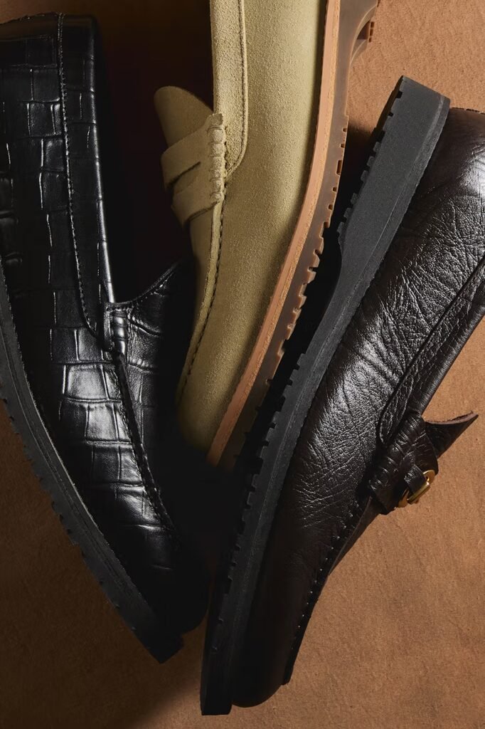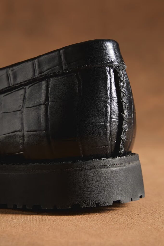 Para fechar o pacote, uma quarta iteração surge em couro preto com textura croco, optando por um visual mais limpo e sem tiras no cabedal. Um dos grandes diferenciais técnicos desta colaboração é a implementação de solados Vibram. Geralmente associada a calçados de performance e montanhismo, a tecnologia traz durabilidade, tração e um contraste visual robusto que moderniza a silhueta do loafer, tornando-o apto para o uso urbano intenso.