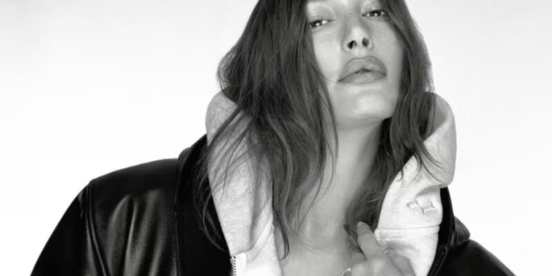 A coleção é ancorada por uma jaqueta de couro zip-up de corte quadrado e moletons combinando, ambos apresentando a assinatura de ombros estruturados de Hailey — um detalhe que ela vem antecipando em suas recentes aparições de street style.