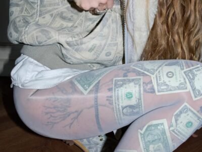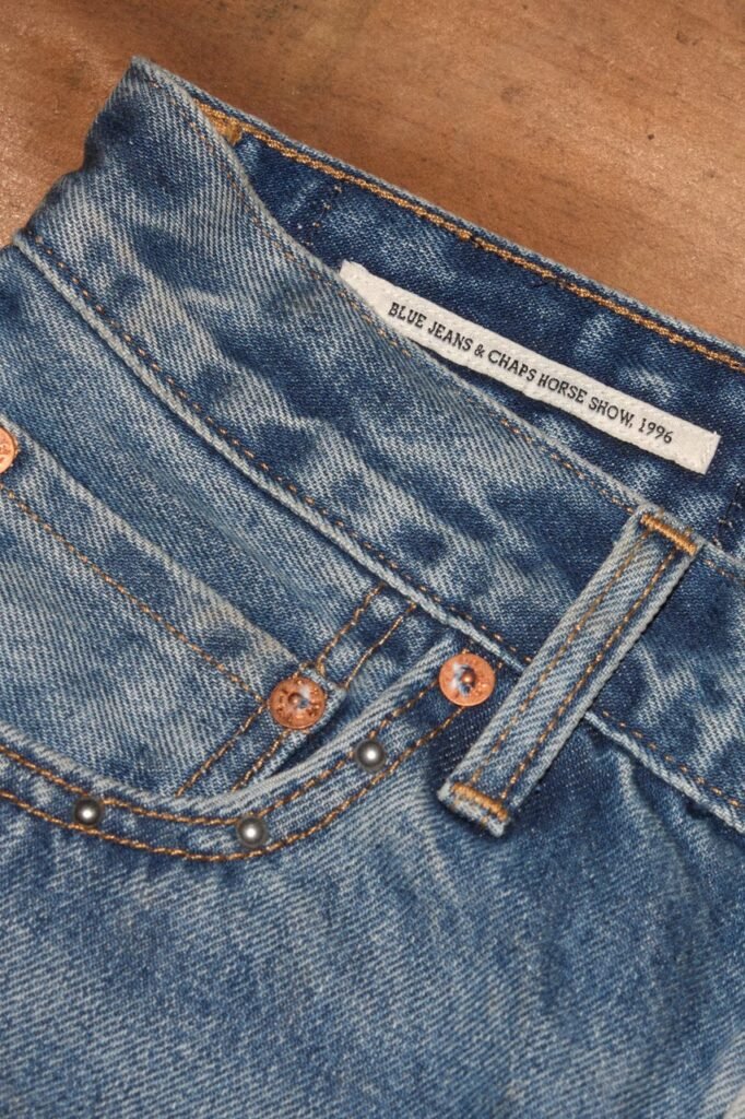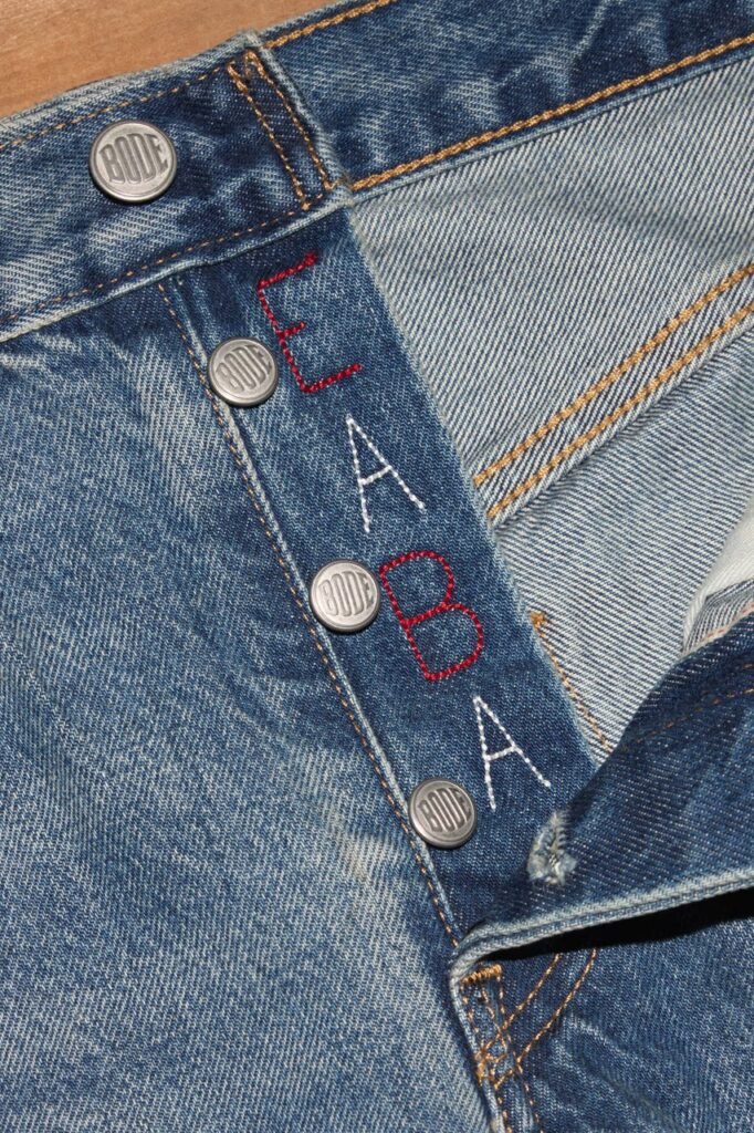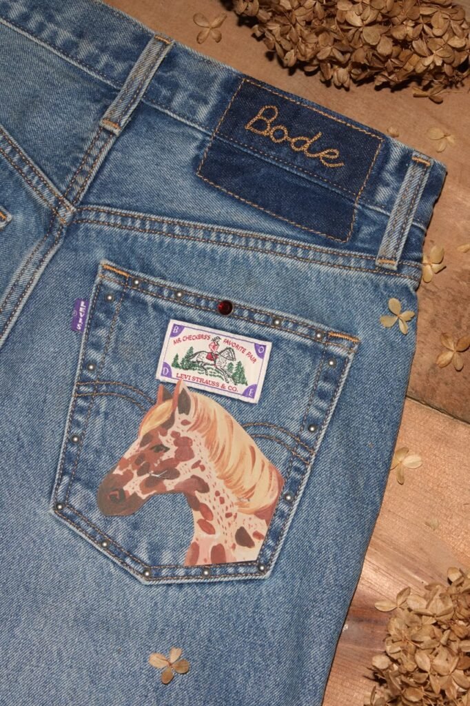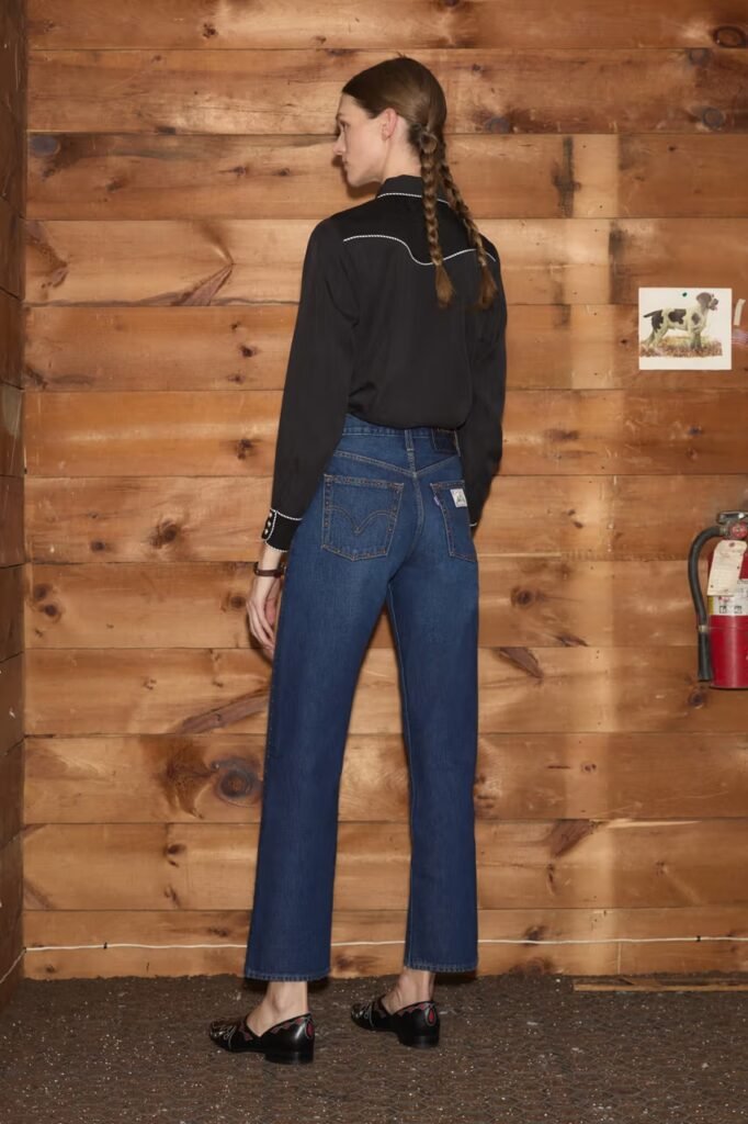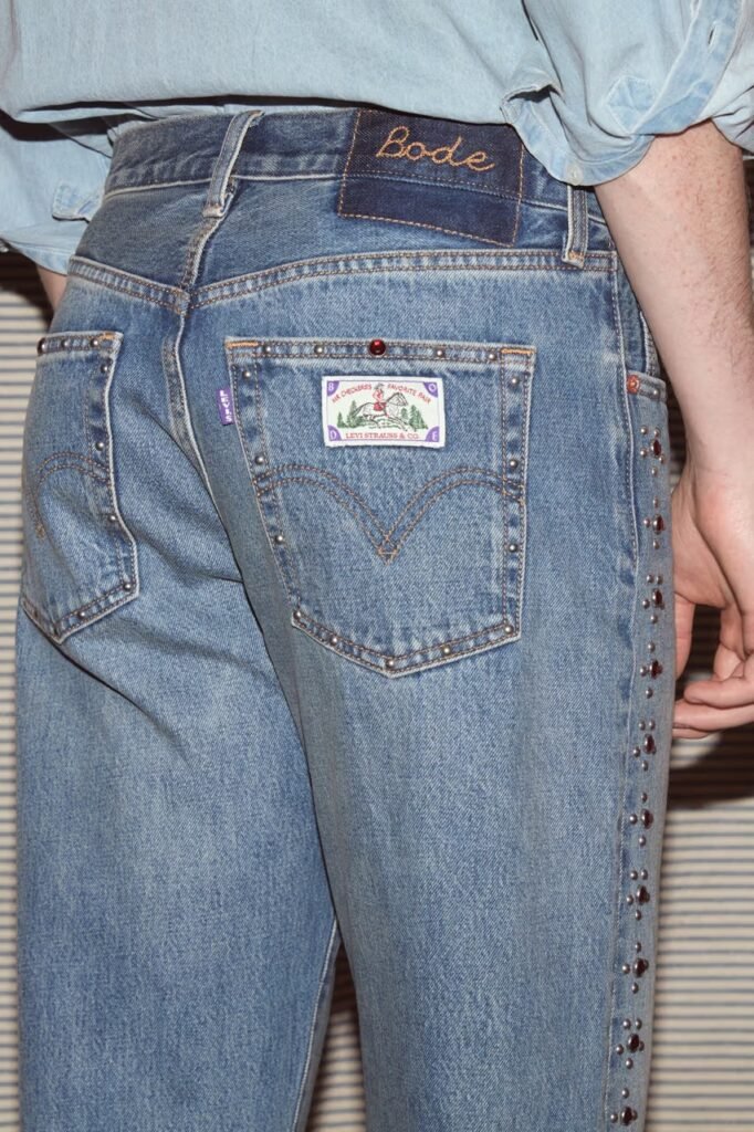 A profundidade da parceria se revela nos detalhes biográficos inseridos por Emily Bode. O jeans é uma homenagem a Checkers, o pônei de infância da estilista, que aparece em etiquetas personalizadas e em uma fotografia vintage impressa no forro do bolso interno. Outras modificações sutis, como o shadow patch com bordado em ponto corrente e a substituição da clássica red tab por uma purple tab, sinalizam a exclusividade da colaboração e o respeito da Levi’s pela identidade autoral da Bode.
