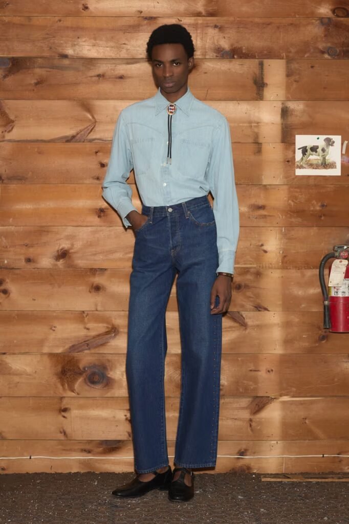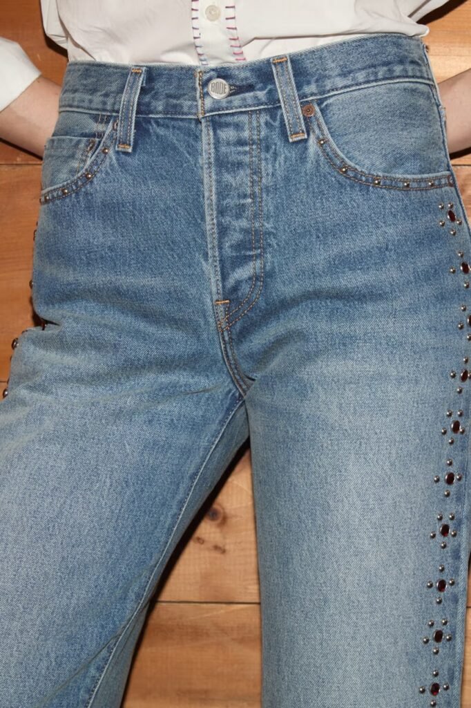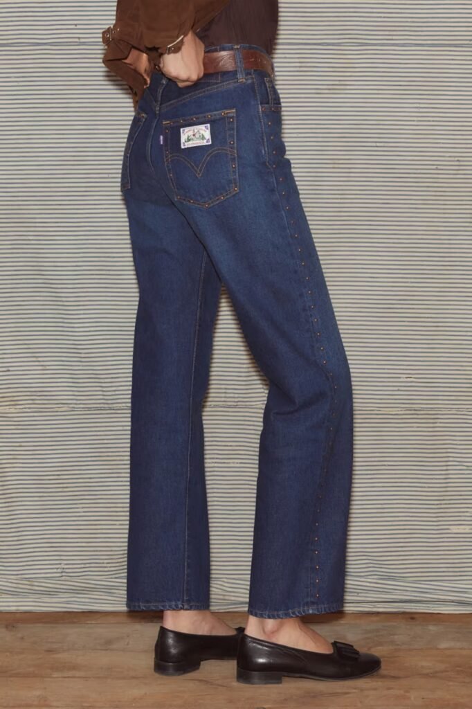 Confeccionado em selvedge denim de 14 onças pré-encolhido, o modelo é apresentado em duas lavagens distintas que referenciam o estilo western de meados do século XX. A versão clara traz aplicações de tachas prateadas e pedras vermelhas, inspirada nos trajes de rodeio dos anos 50, enquanto a lavagem escura aposta em tachas de cobre nas costuras laterais. A execução técnica mantém a durabilidade histórica da Levi’s, mas recebe intervenções de design que elevam a peça ao território do luxo colecionável.