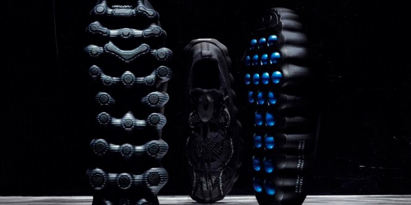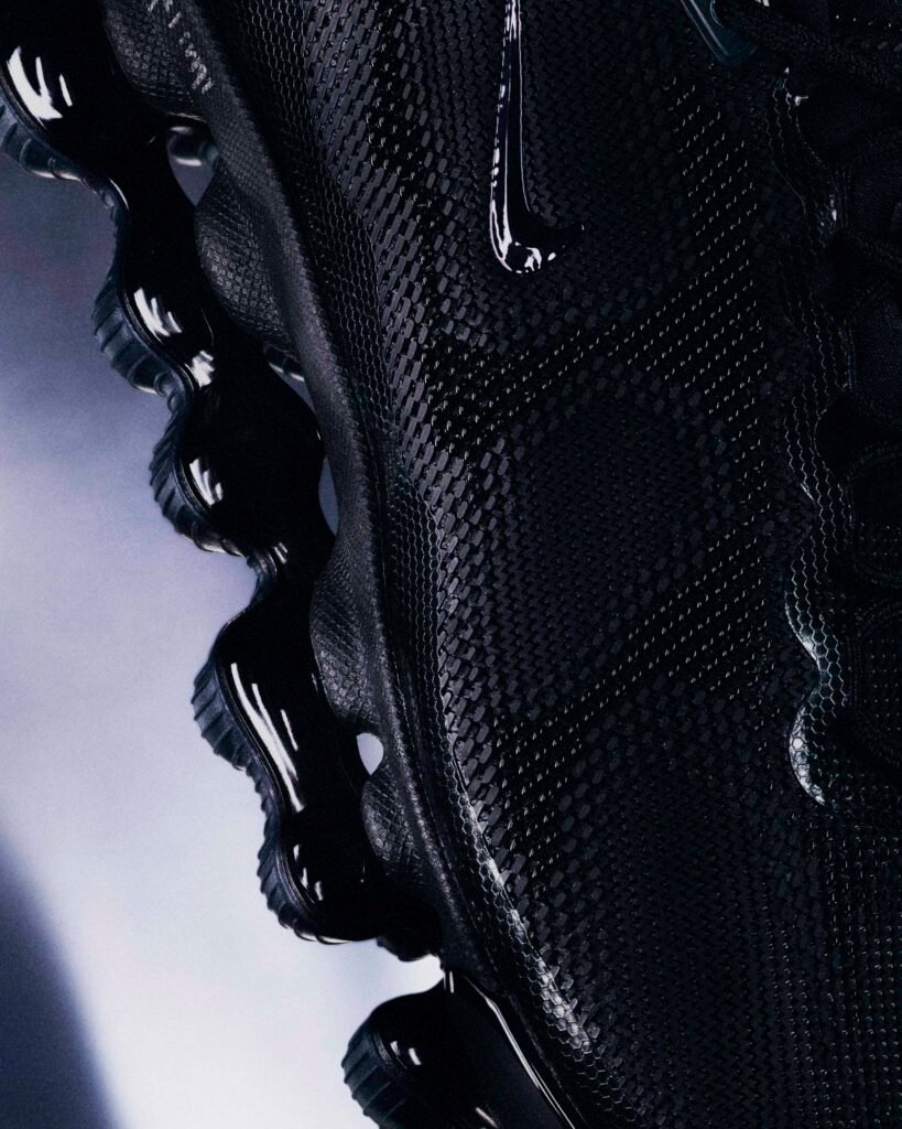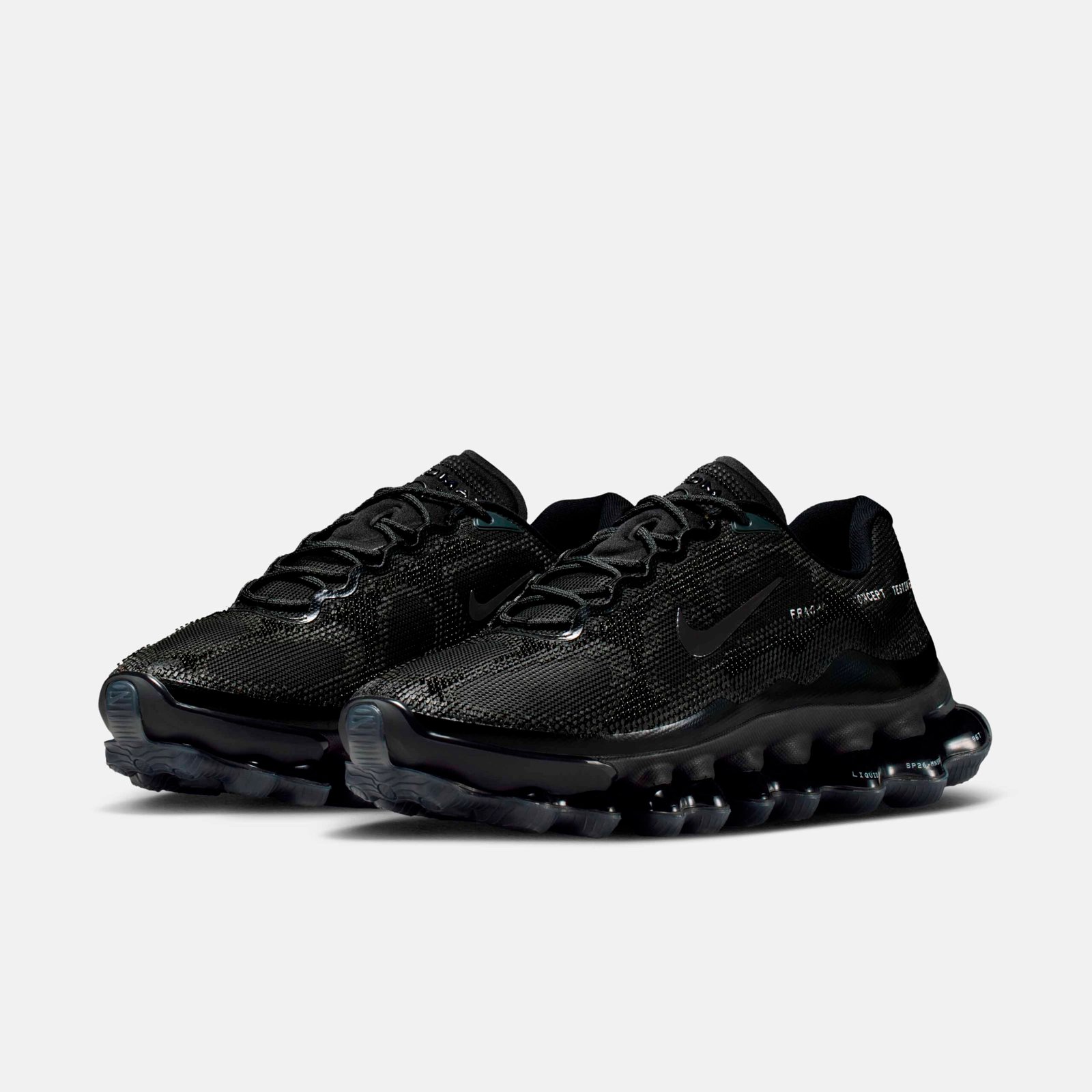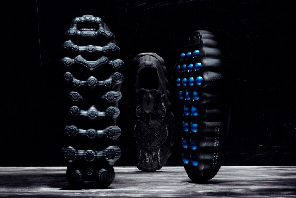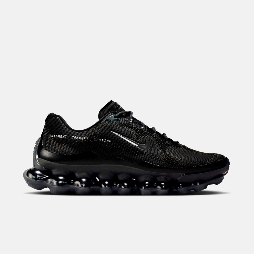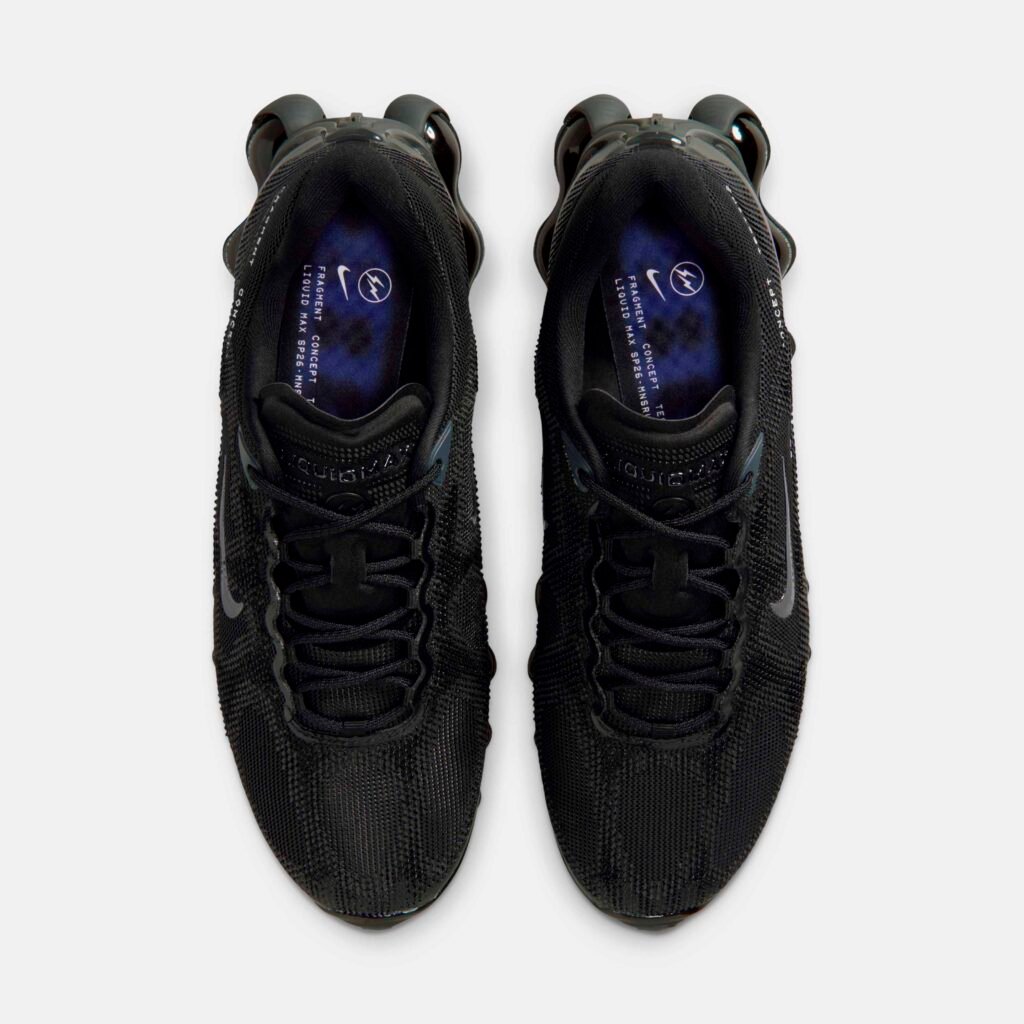 Já o Air Liquid Max surge em uma execução all-black, sendo a primeira colaboração oficial sobre a nova tecnologia de amortecimento da Nike. A silhueta utiliza o sistema Point-Loaded Air, que distribui o ar apenas onde é necessário, criando uma geometria agressiva e leve. O branding estendido na lateral reforça a estética de “teste de conceito” que define esta fase da união entre o godfather do streetwear e a marca do Swoosh.