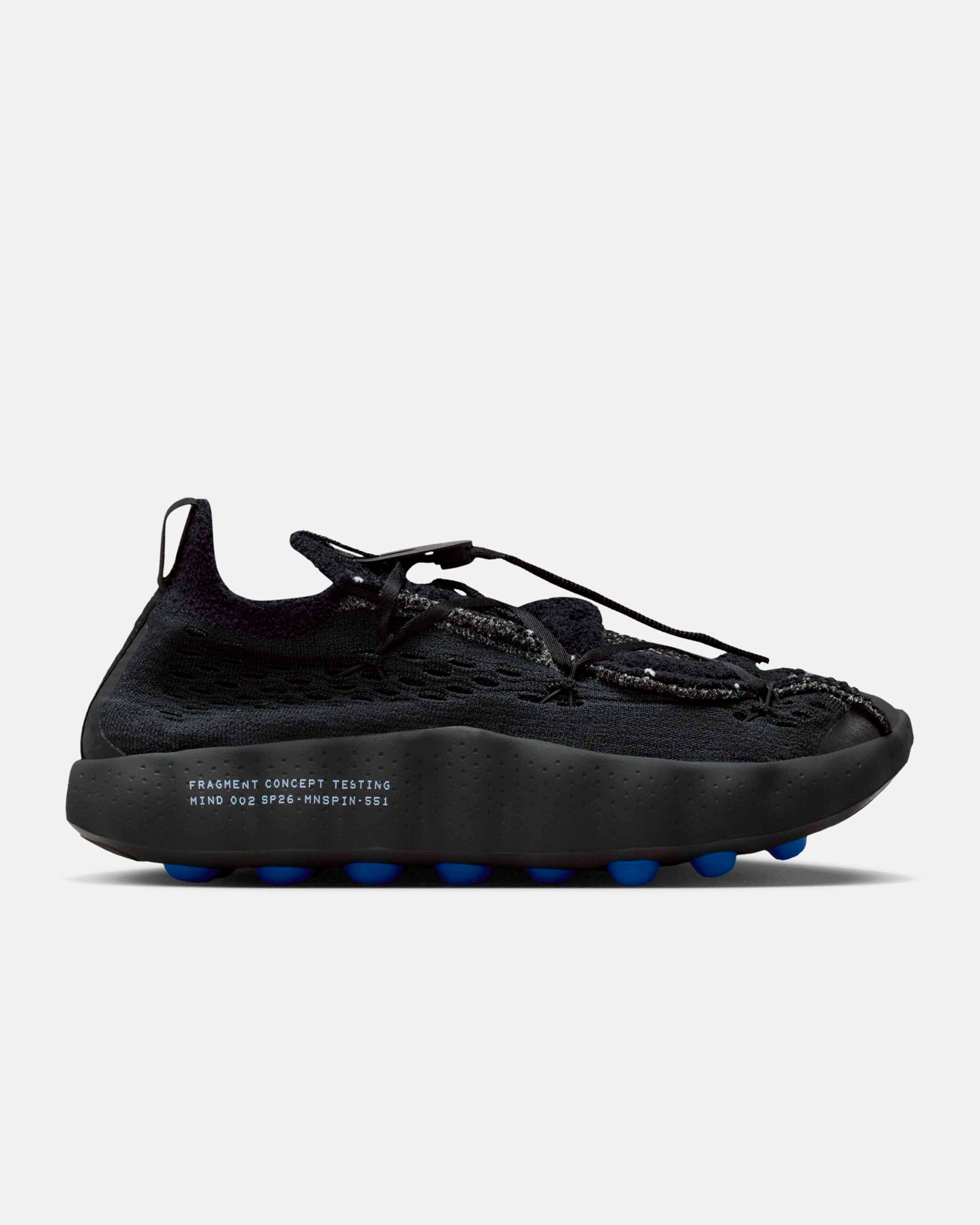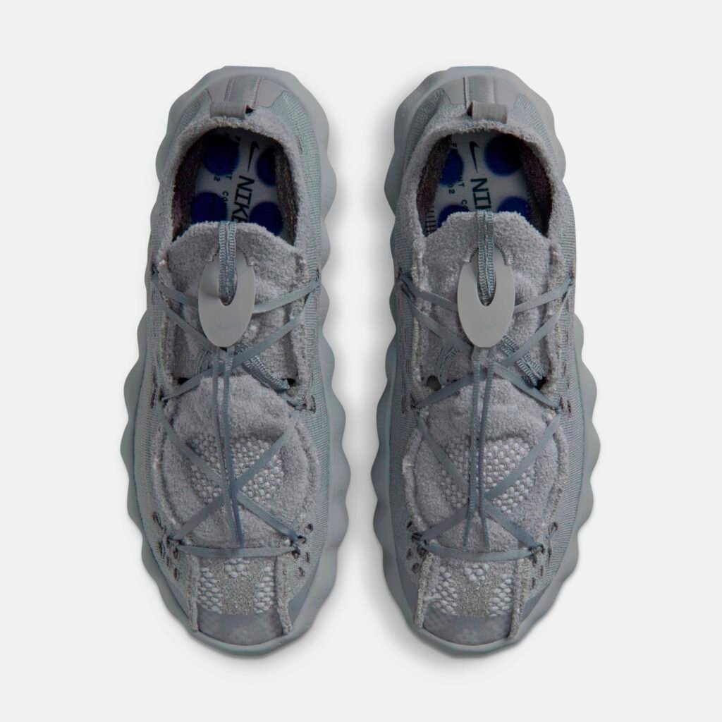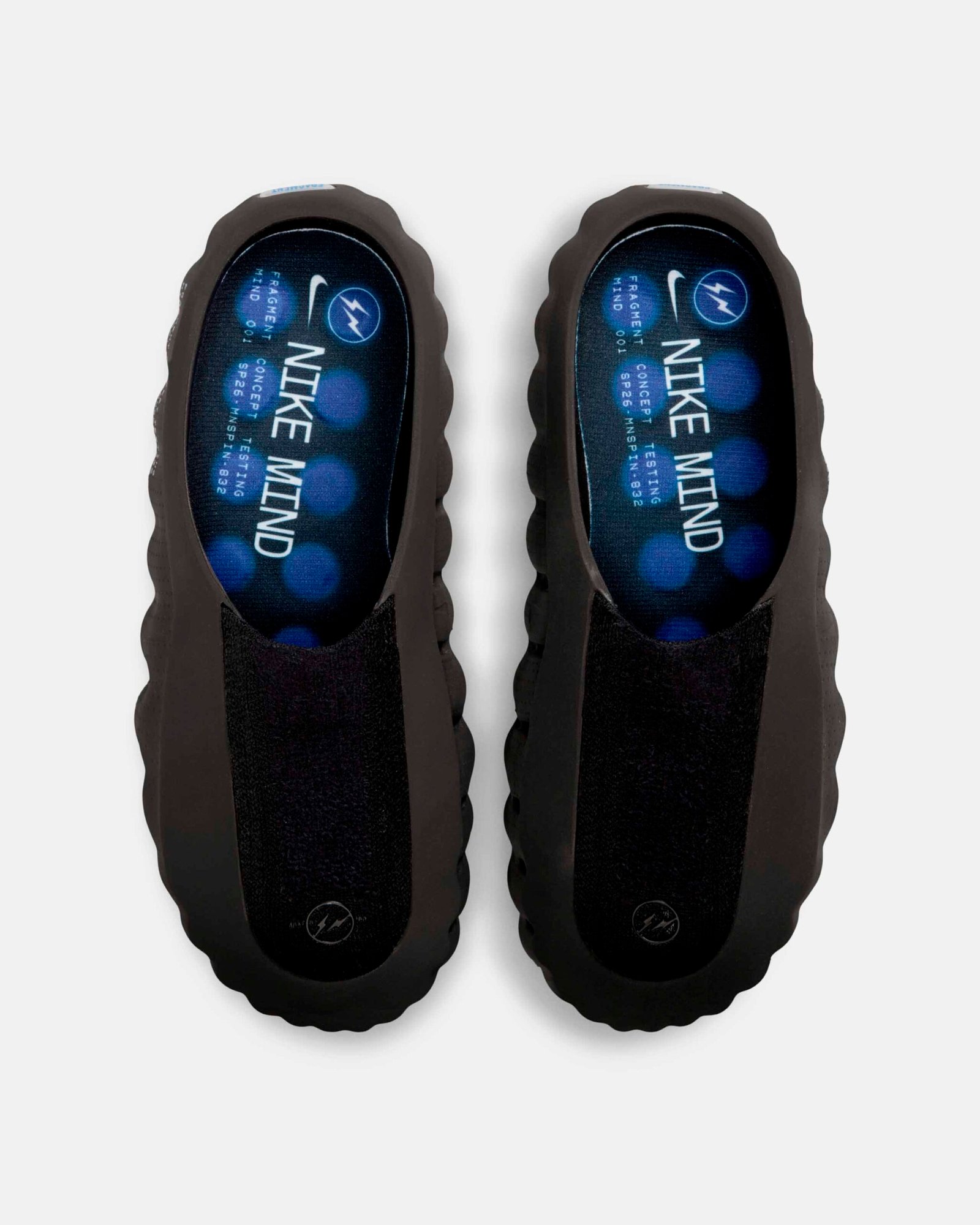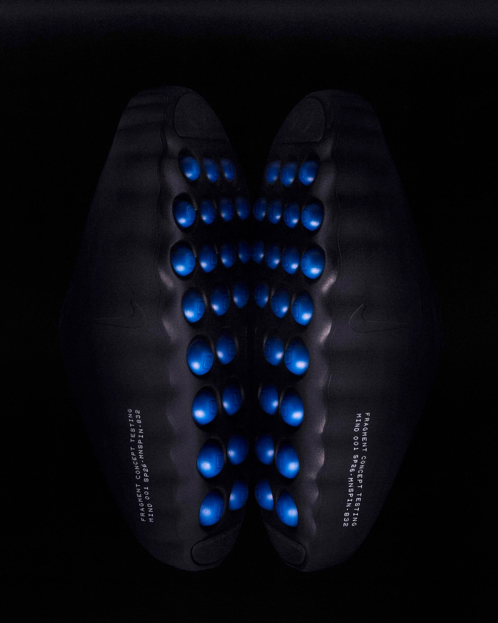 O destaque técnico recai sobre a linha Nike Mind, baseada em neurociência para promover relaxamento através de estímulos sensoriais. O modelo Mind 002 recebeu a transformação mais radical desta collab, substituindo a construção original por um cabedal integral em Flyknit. A estrutura utiliza 22 sensores de espuma independentes que mapeiam pontos de pressão anatômicos, todos tingidos no icônico azul da fragment design.